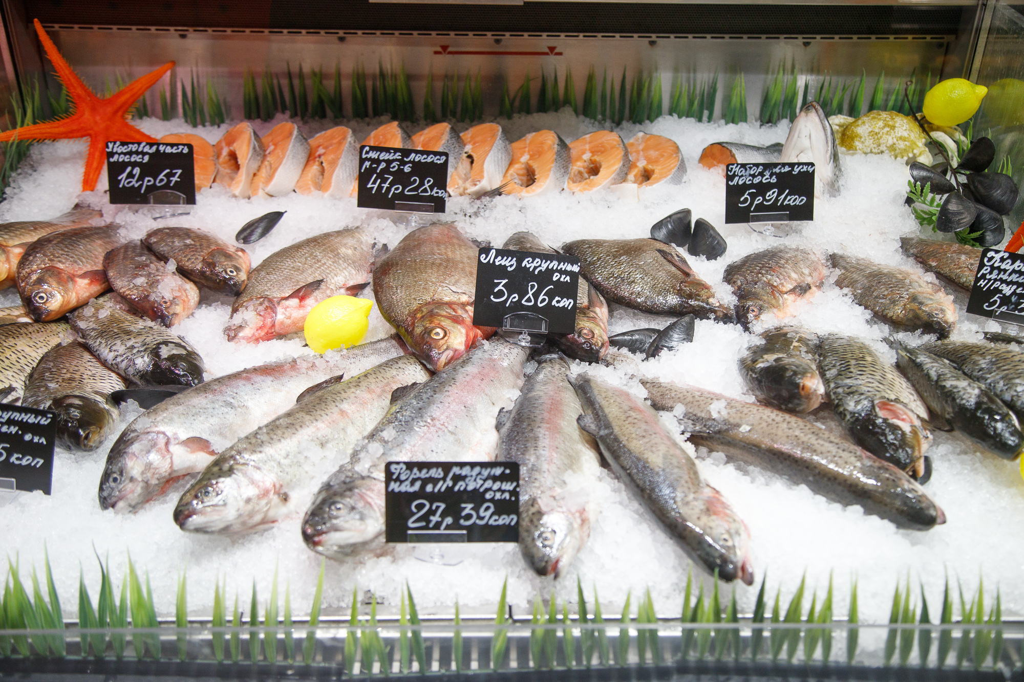 В магазине − большая фиш-витрина с охлажденной и замороженной рыбой, а также разные виды мидий и креветок.