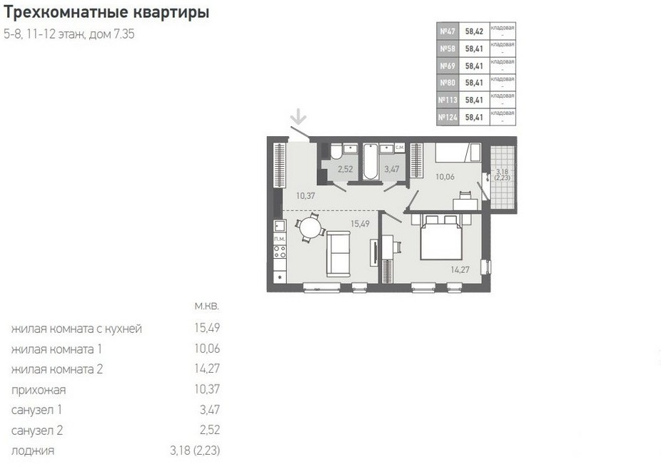 Рассмотрев планировки, берем калькулятор и начинаем считать. Перед нами − евродвушка площадью 48 квадратных метров и евротрешка площадью 58 квадратных метров. Эти квартиры будут сдаваться с готовыми планировками, возведенными перегородками и оштукатуренными стенами. Новоселам останется самостоятельно развести электрику и можно приступать к финишной отделке.