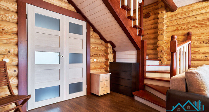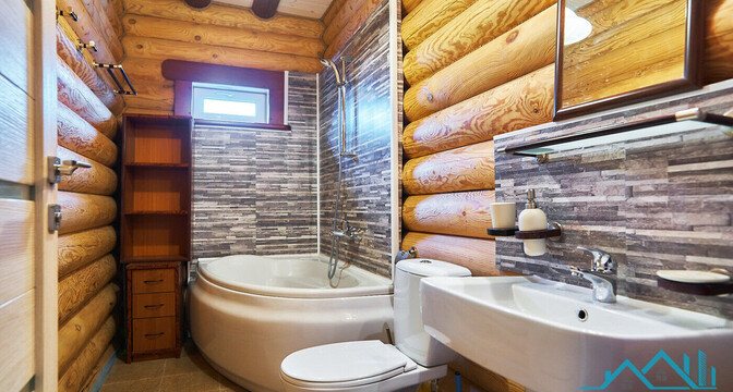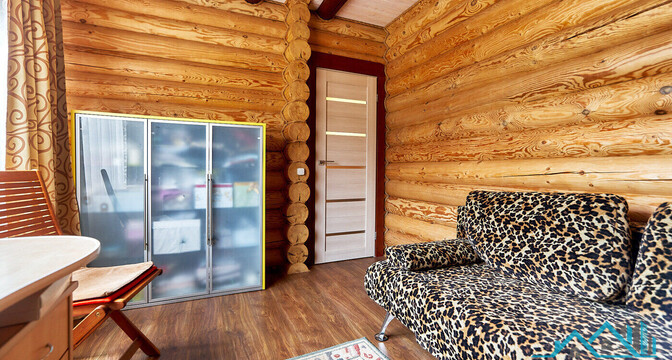 Брус внутри решили не прятать. Пол и потолок также отделан деревом. В санузле лежит плитка.
