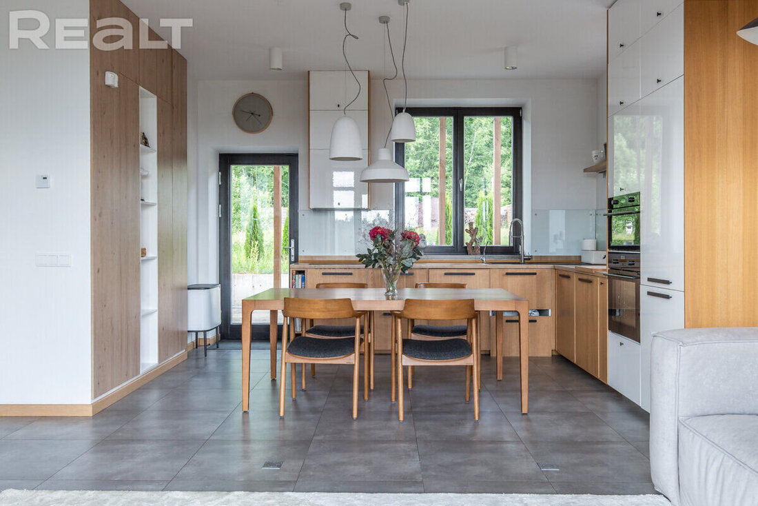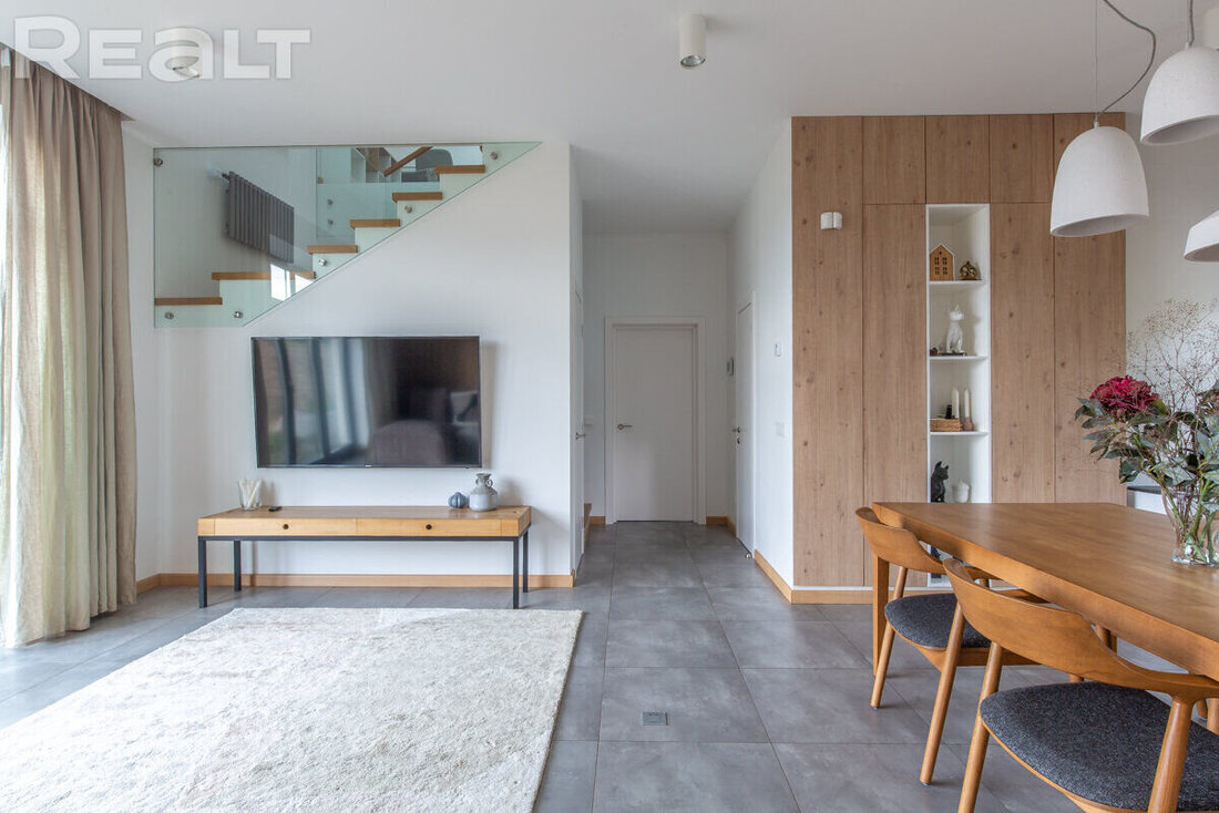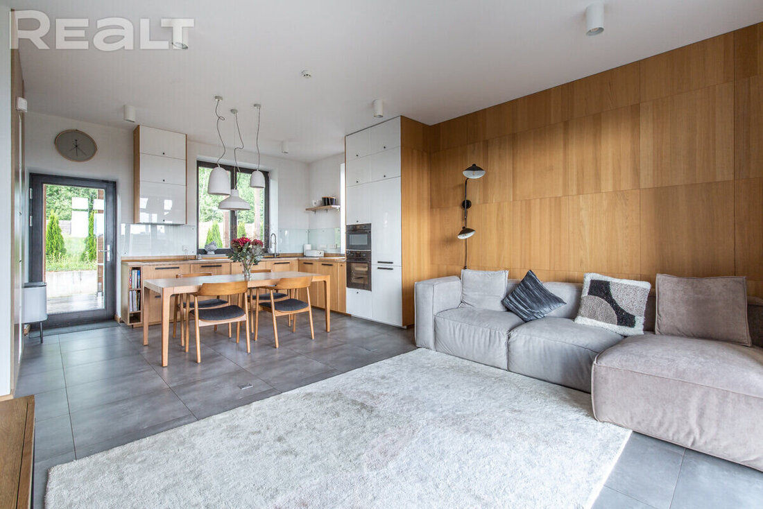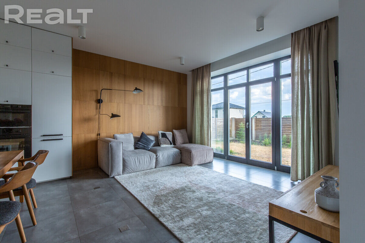 На первом этаже — гостиная с обеденной зоной и панорамным остеклением. Кухонная техника — Whirlpool.