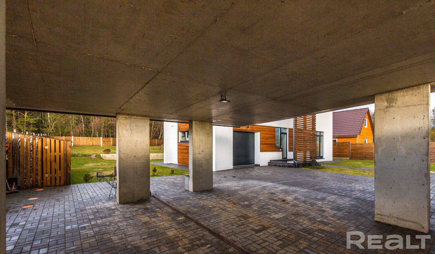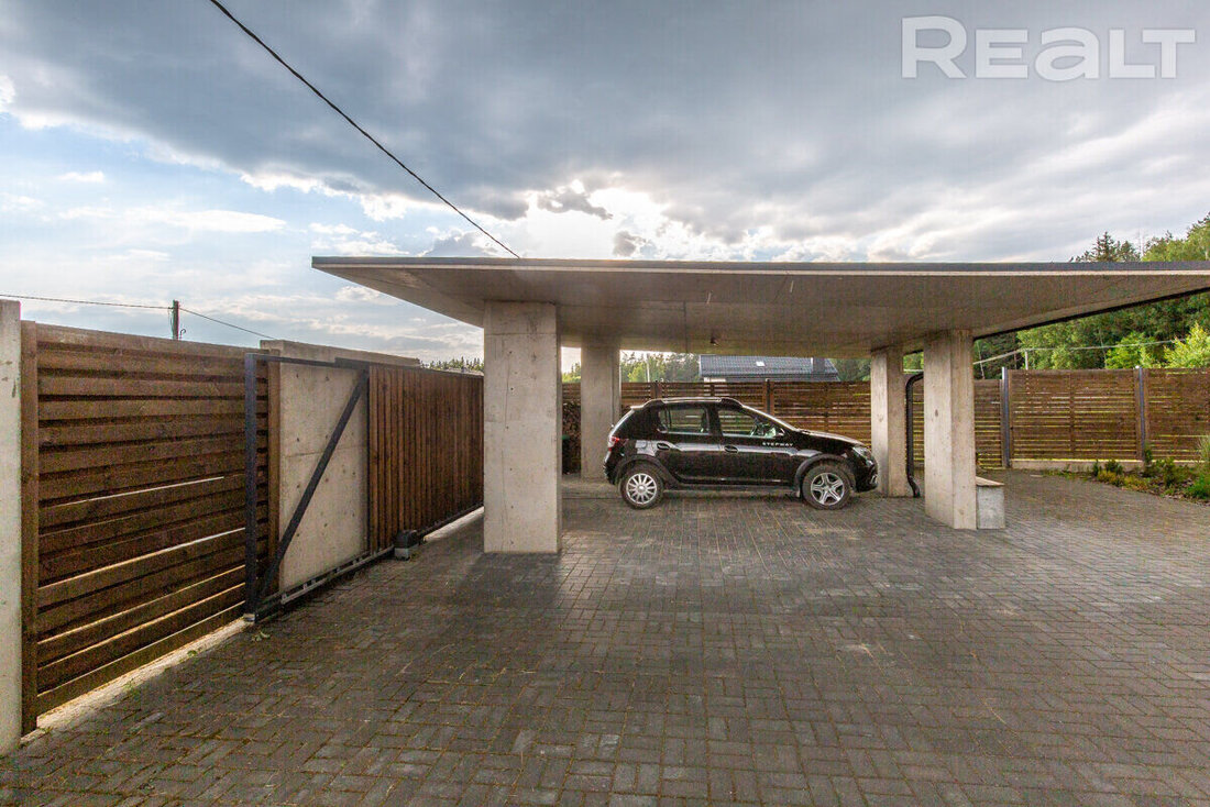 Есть терраса и теплый гараж. Кроме того, есть еще и навес на две машины.