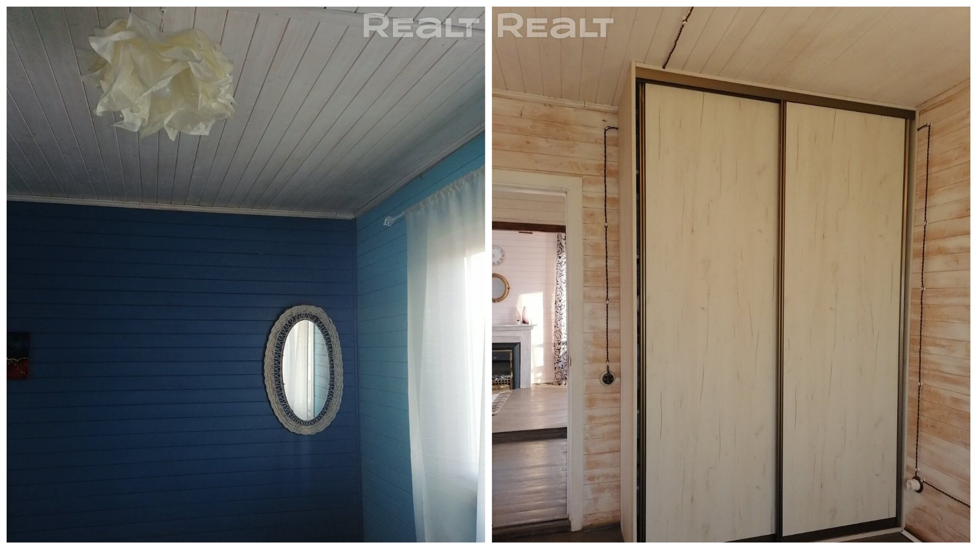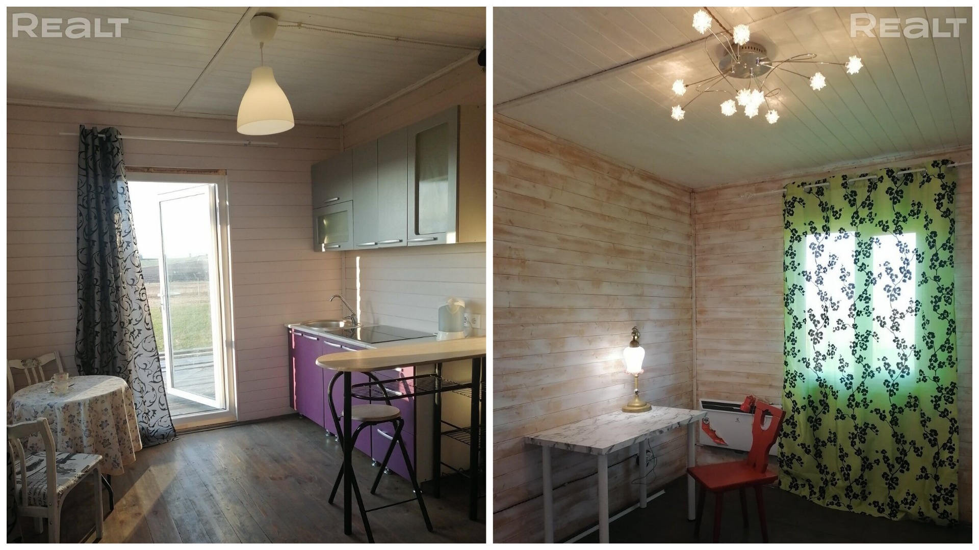 В доме сделан хороший ремонт. Есть совмещенная кухня-гостиная и две отдельные жилые комнаты. Объект продается с мебелью: стоят два шкафа-купе, висит кухонный гарнитур с индукционной плитой. В доме оборудован камин, установлены кондиционер и бойлер. Также есть выход на небольшую террасу.