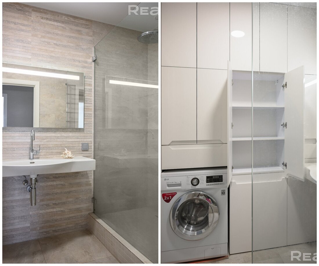 Санузел в квартире раздельный. Душевая довольно просторная: сделаны шкафчики, стоит умывальник и стиральная машина.