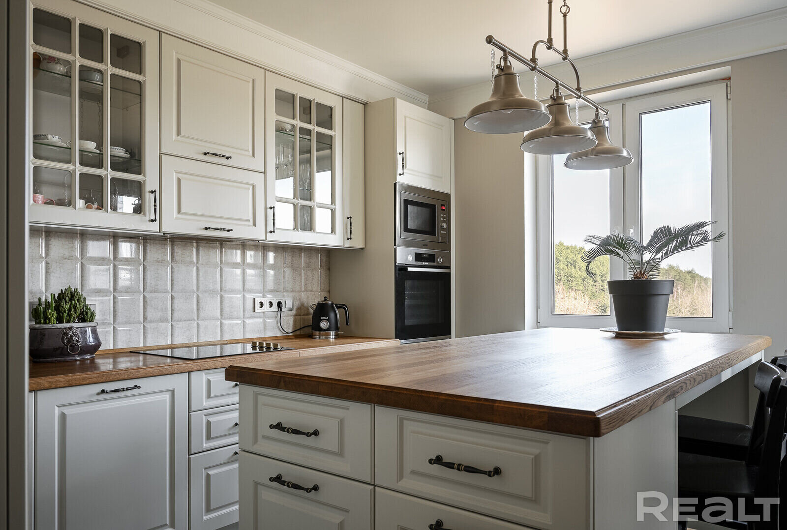 Кухня оборудована необходимой техникой. Есть много мест хранения, в том числе на острове, который служит основной обеденной зоной.
