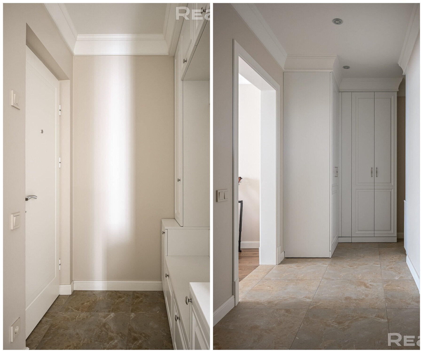 На полу в коридоре и кухне лежит плитка, в комнатах - ламинат.