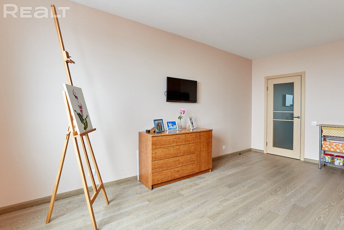 В квартире обустроена кухня-гостиная, откуда можно попасть на застекленную лоджию. Есть тут гардеробная и совмещенный санузел.