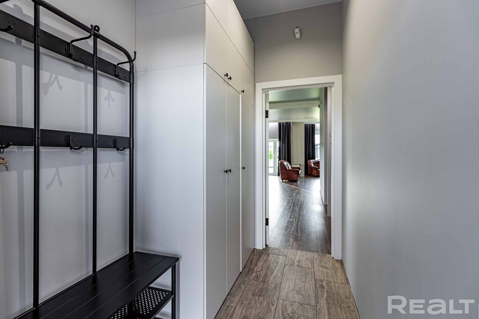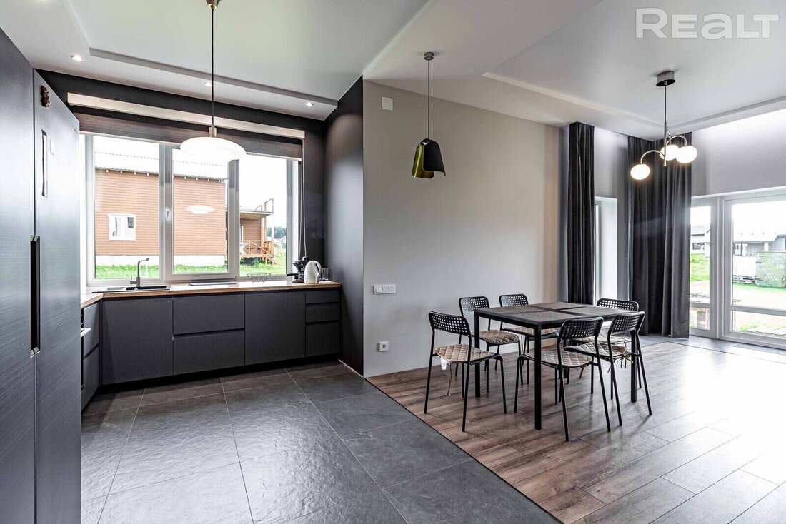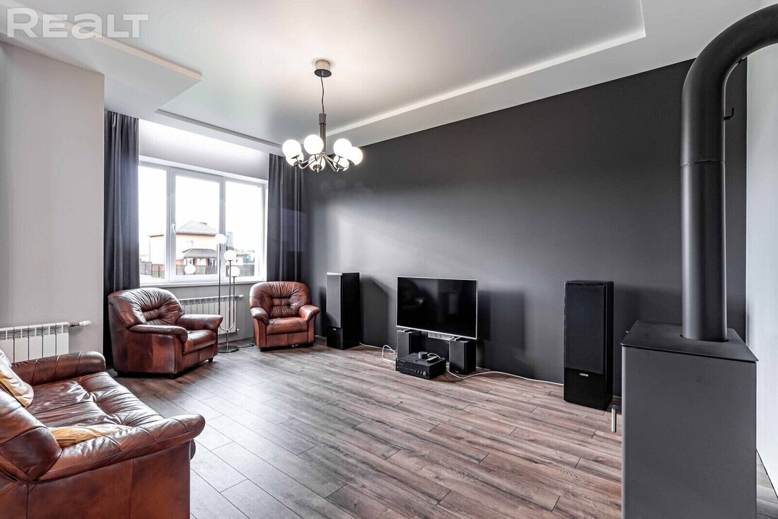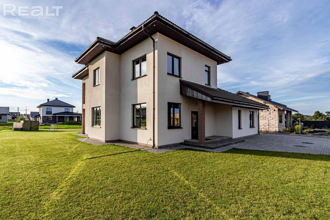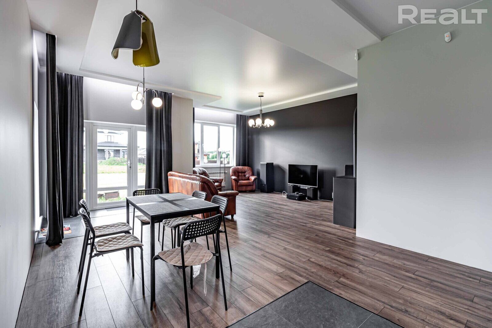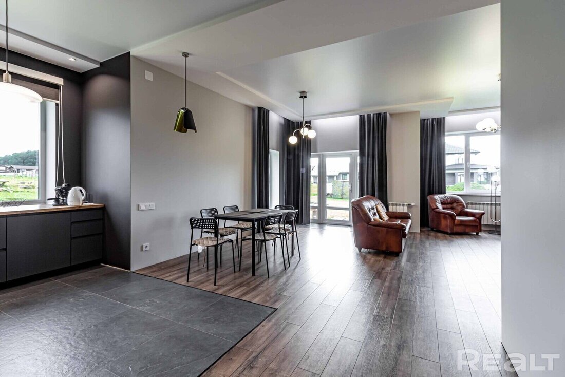 Такие дома, как этот, всегда будут в цене — спокойная архитектура, мощный фундамент, стены из керамзитобетона, черепичная крыша. Он просторный — три спальни, гостиная с камином, два санузла и и даже баня на дровах. Внутри стильный интерьер, премиальное техническое оснащение, новая мебель. И расположение отличное — современный поселок возле Минска с видом на горнолыжный курорт, живописная местность, грибные леса. Вангуем, что в продаже он долго не задержится.