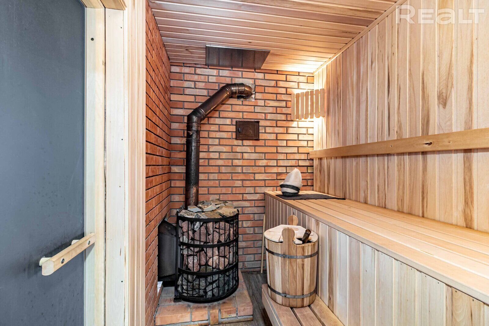 Площади дома достаточно, чтобы разместить на первом этаже полноценную баню на дровах с большой комнатой отдыха, которую можно переформатировать в тренажерный зал, бильярдную или бассейн (есть возможность подключения к канализации).