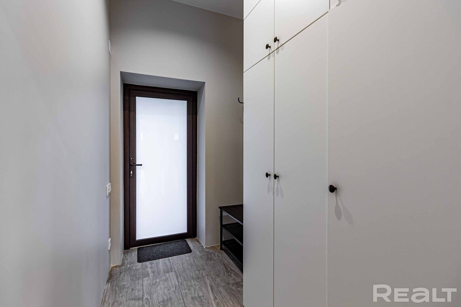 На входе установлены двери Alutech с «теплым» алюминиевым профилем и матовым ударопрочным стеклом. Они не промерзают и не ржавеют. Межкомнатные двери из крашенного МДФ.