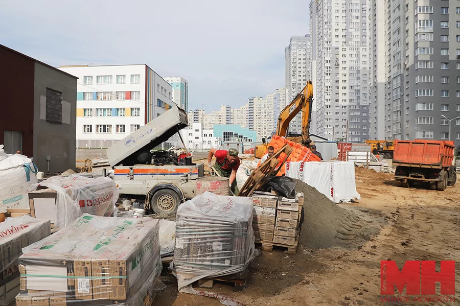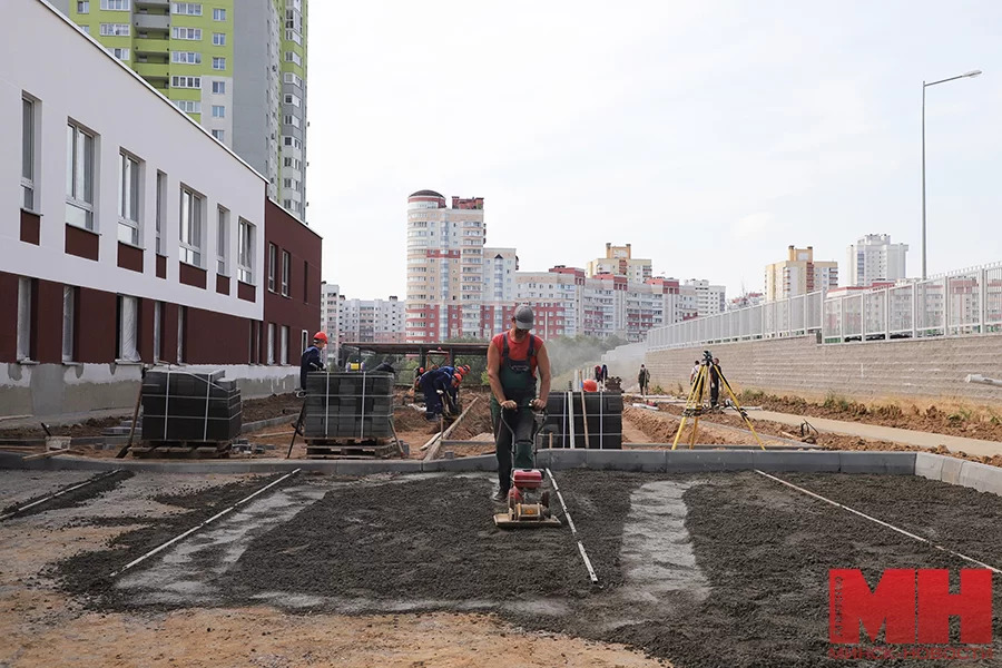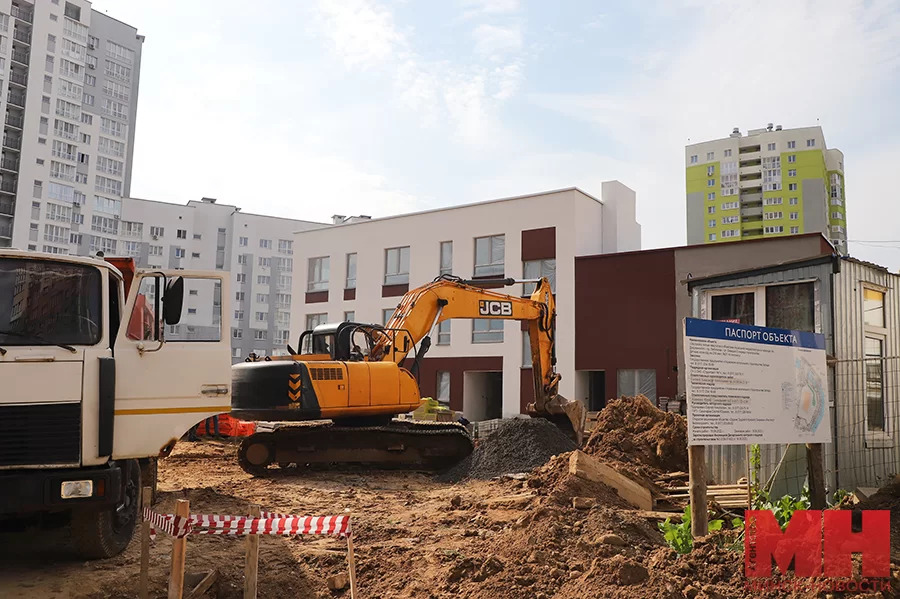 Сейчас сад готов на 90% — заливают стяжку, облицовывают санузлы, красят стены. На территории строители укладывают тротуарную плитку, монтируют теневые навесы из деревянной обрешетки. Рядом с каждым небольшое помещение-кладовая для хранения оборудования и инвентаря для детских прогулок. Подведены шланги для подачи воды, чтобы после променадов и активных занятий на свежем воздухе можно было сразу помыть игрушки.