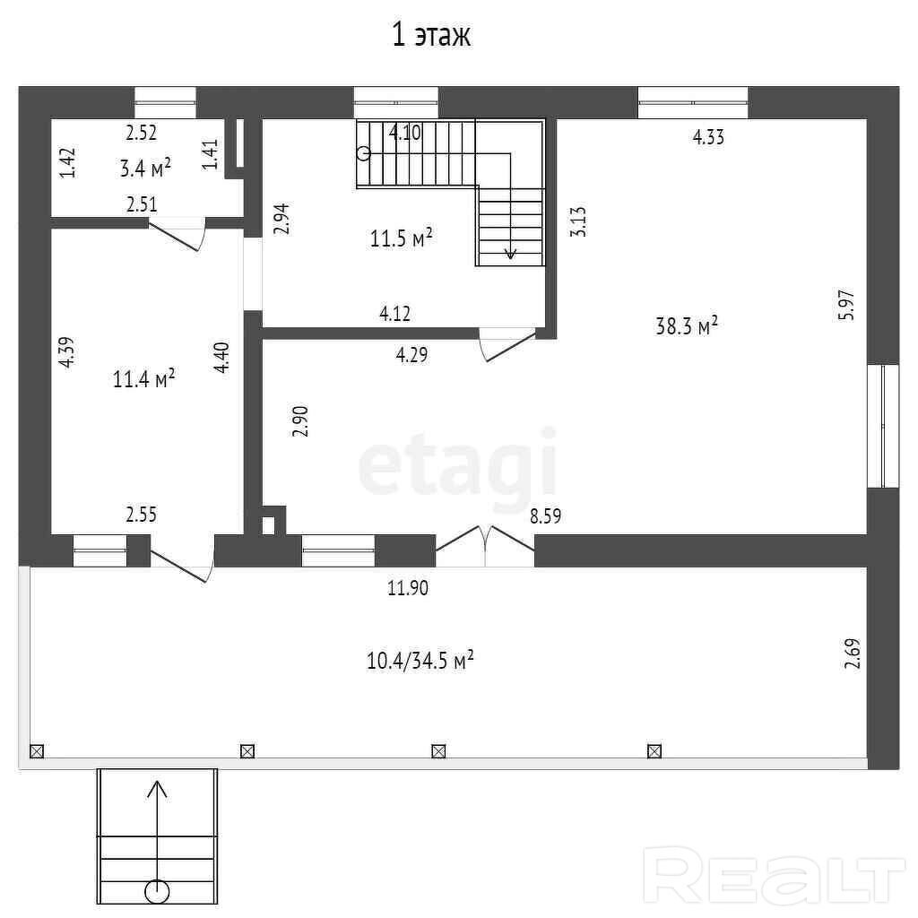 Общая площадь — 192,6 м2. Внутри находятся кухня-гостиная с выходом на просторную террасу, три раздельные комнаты, два санузла (по одному на этаж). Жилые этажи между собой связывает деревянная лестница. В цоколе находим гараж и пространство под котельную.