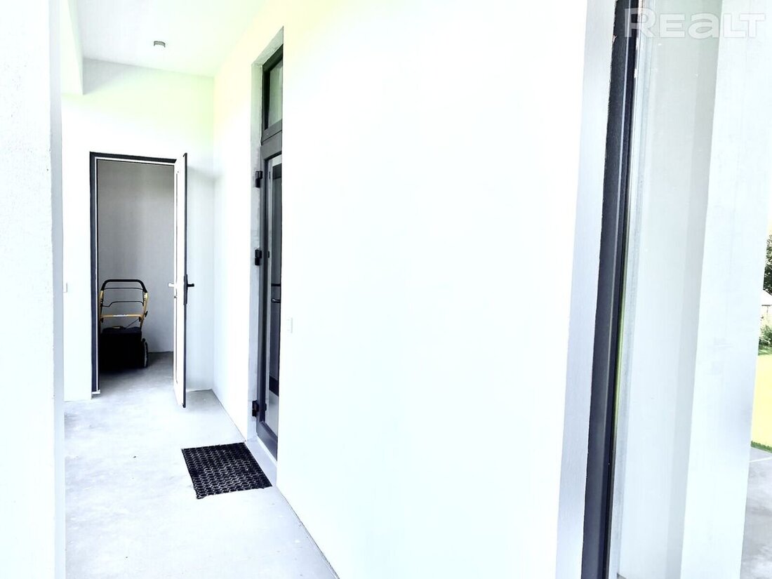 Архитектура дома современная, европейская — простые формы, плоская крыша в нескольких уровнях, утопленные в тело строения входная зона и терраса, окна в пол. Фасады белоснежные, с черными контрастными прямоугольниками оконных рам. Стеклопакеты панорам имеют заводскую тонировку, поэтому находящимся внутри жильцам обеспечана конфиденциальность. Впрочем, до ближайших соседских окон 200 метров и любопытствующие взгляды исключены.