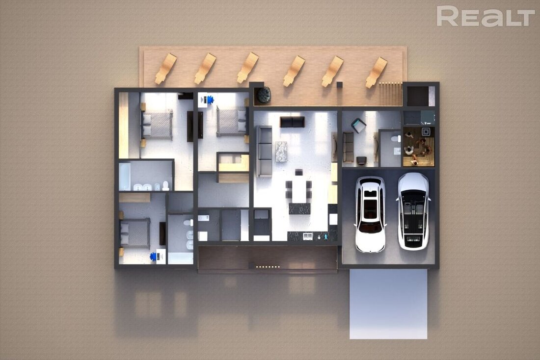 Общая площадь с учетом гаража на две машины — 280 квадратов. Планировка удобная и продуманная, все помещения расположены в одном уровне, без лестниц и порогов.