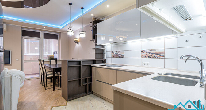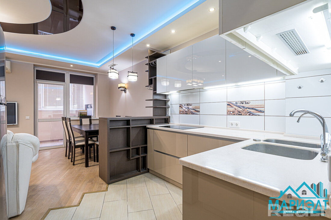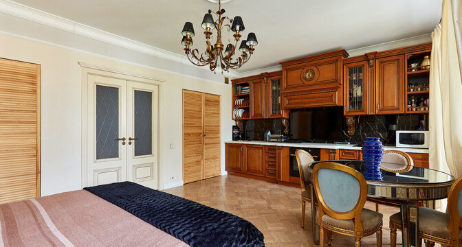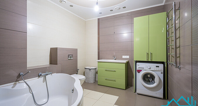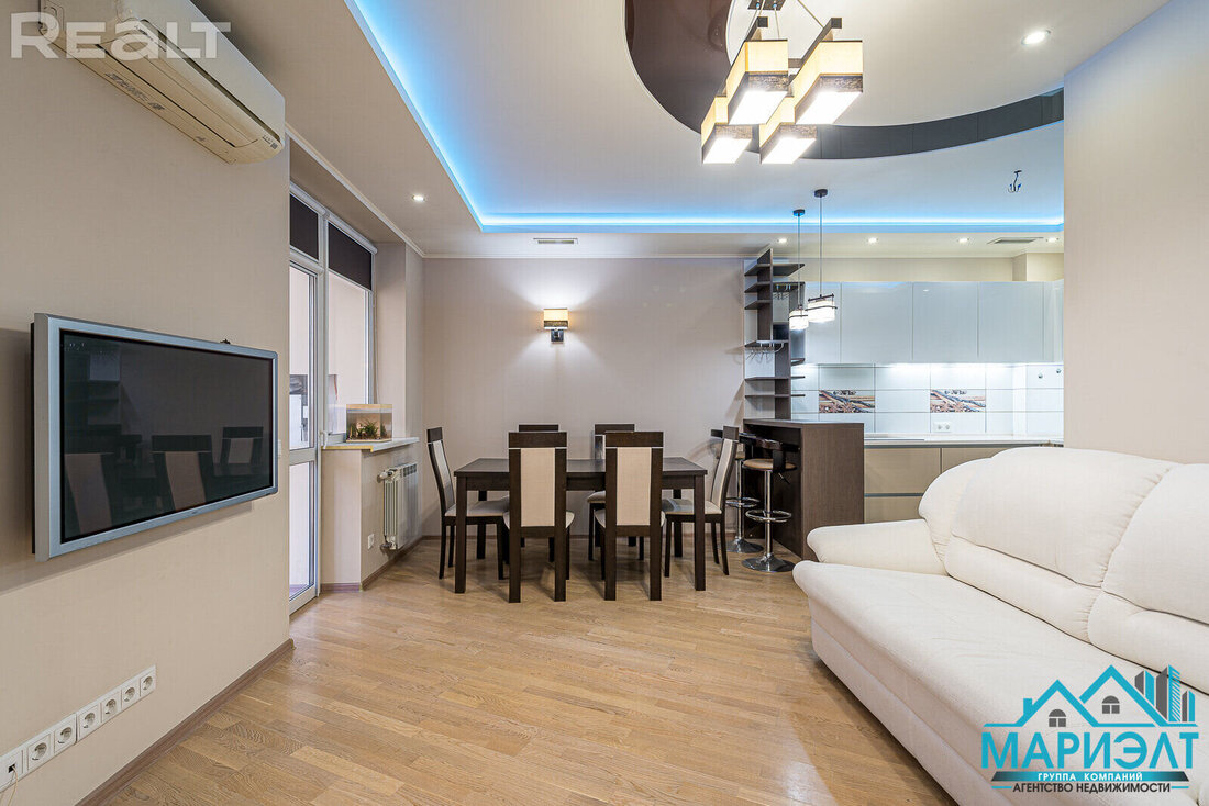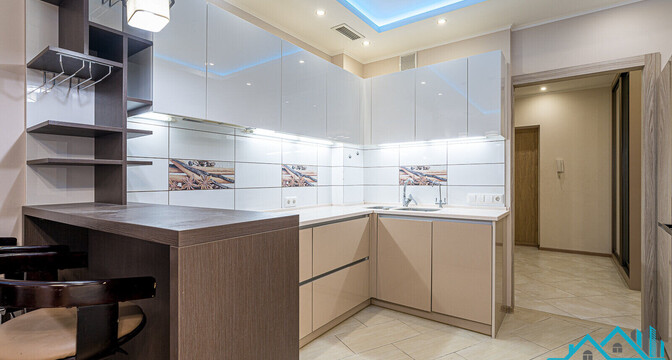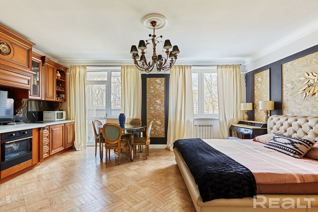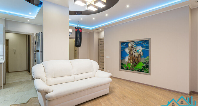 Самое дорогостоящее предложение — квартира площадью 78 «квадратов» с дизайнерским евроремонтом. В просторной двушке на седьмом этаже квартире выполнена и узаконена перепланировка. По всей квартире разведена система приточно-вытяжной вентиляции с рекуперацией тепла. Имеется инверторная мульти сплит-система кондиционирования воздуха Mitsubishi Heavy; брендовая сантехника Roca и Latorre; теплые полы в санузлах и коридоре; огромный холодильник на 490 литров, посудомоечная машина, духовой шкаф, встроенная микроволновая печь, встроенная вытяжка, варочная панель, 6-ти ступенчатая система очистки воды, бойлер на 50 литров, стиральная машина. Также тут есть собственная система видеонаблюдения с установленной IP-камерой. Стоимость — 138 тысяч долларов (1758 долларов — за метр).