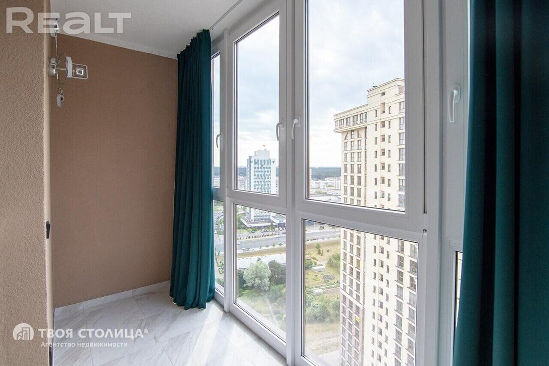 Как отмечается в объявлении, с верхнего этажа открывается красивый вид. Высокие потолки (2,7), панорамные окна на лоджии и в жилой комнате обеспечивают хорошую освещенность, визуально делая комнату просторнее.