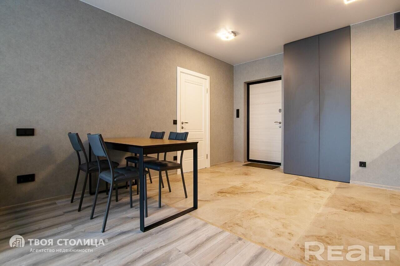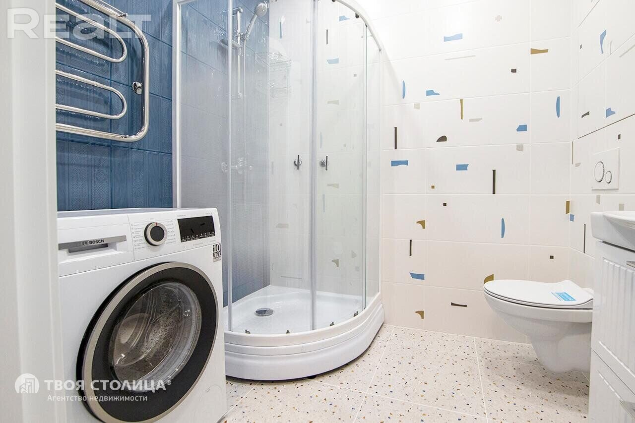 Квартира находится на 21-м этаже. Пространство зонировано на кухню и жилую зону. В кухонной зоне есть встроенная мебель с бытовой техникой Bosch и обеденная группа. В жилой зоне − диван, мебель для гостиной, телевизор. В прихожей есть встроенный шкаф, в санузле установлена душевая кабина, мебель для ванной комнаты, стиральная машина Bosch.