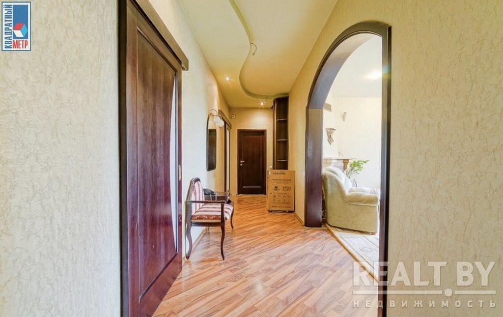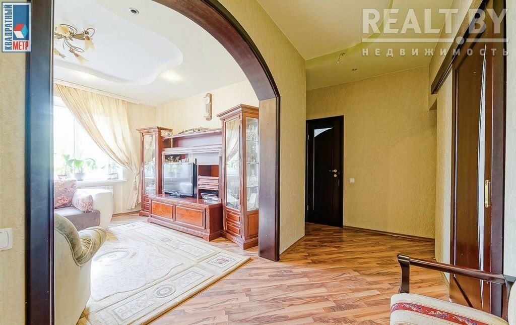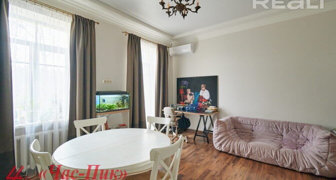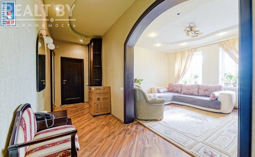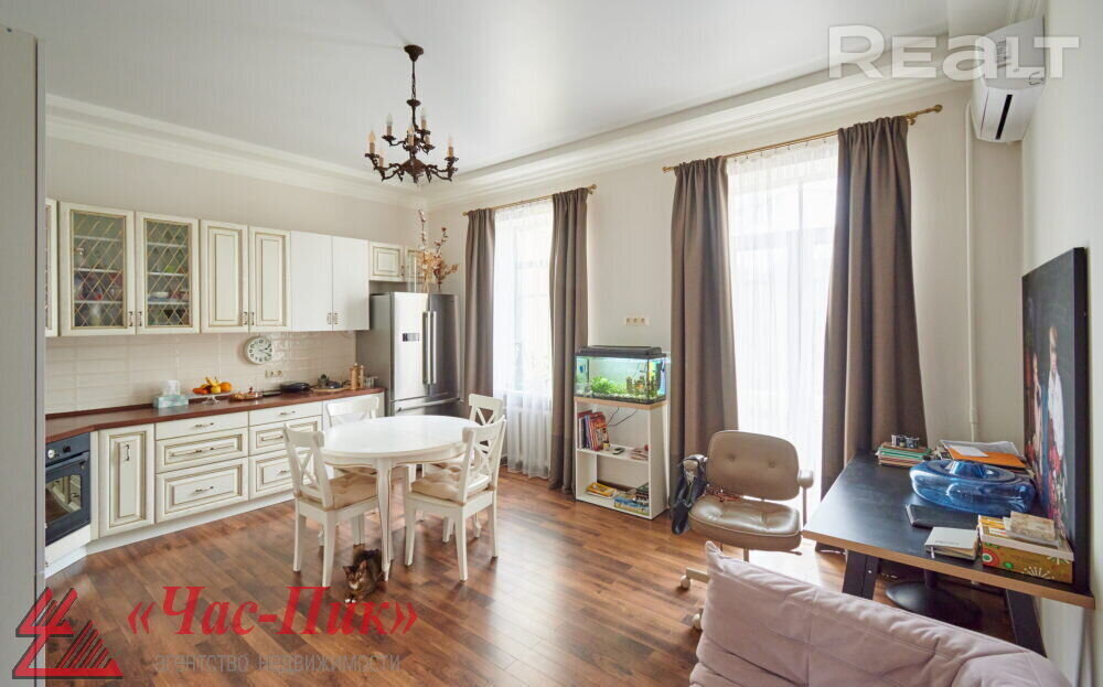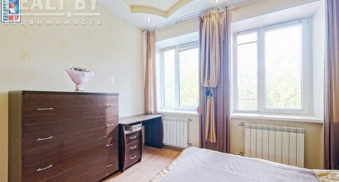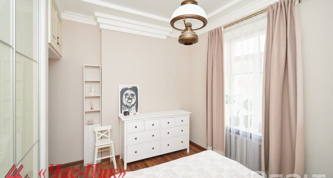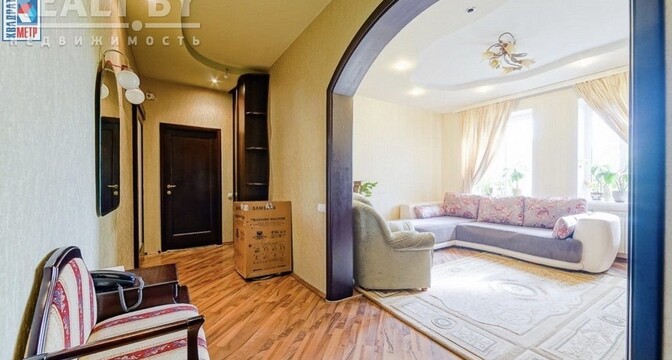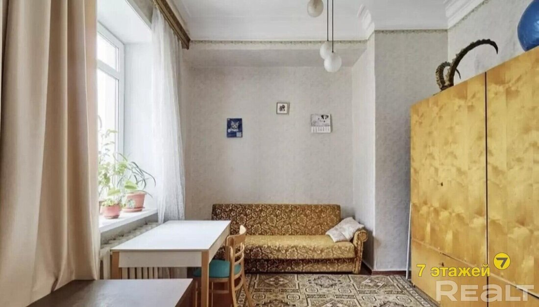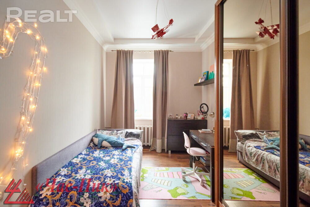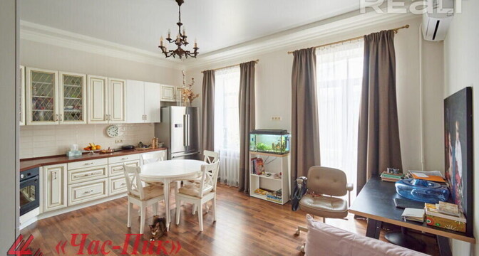 Во второй части генеральского дома продается трехкомнатная квартира с хорошим ремонтом. По адресу фактически это соседний дом — проспект Независимости, 93. Квадрат в этой квартире обойдется почти в два раза дороже, чем в квартире на Независимости, 91 из нашей подборки.