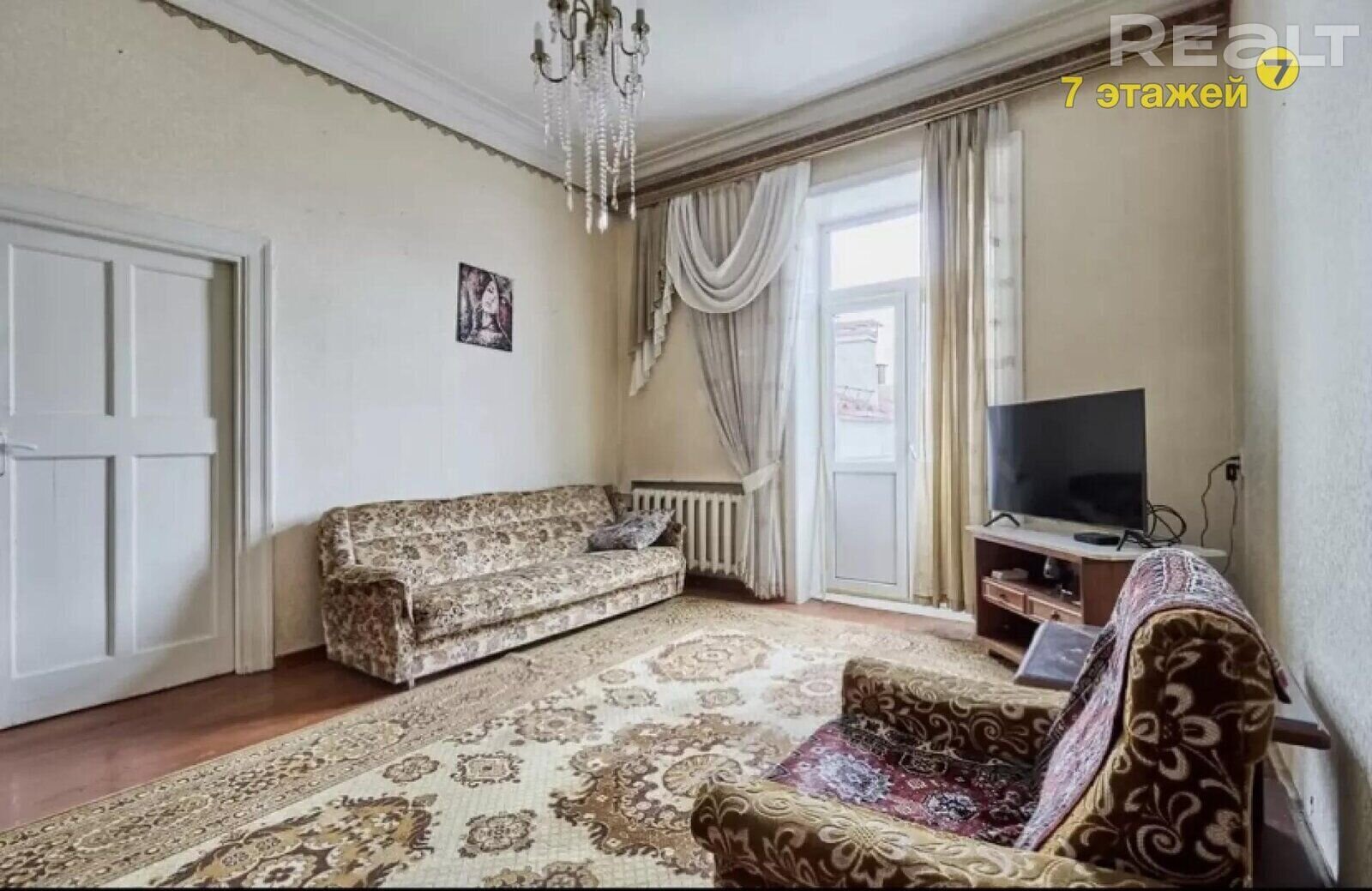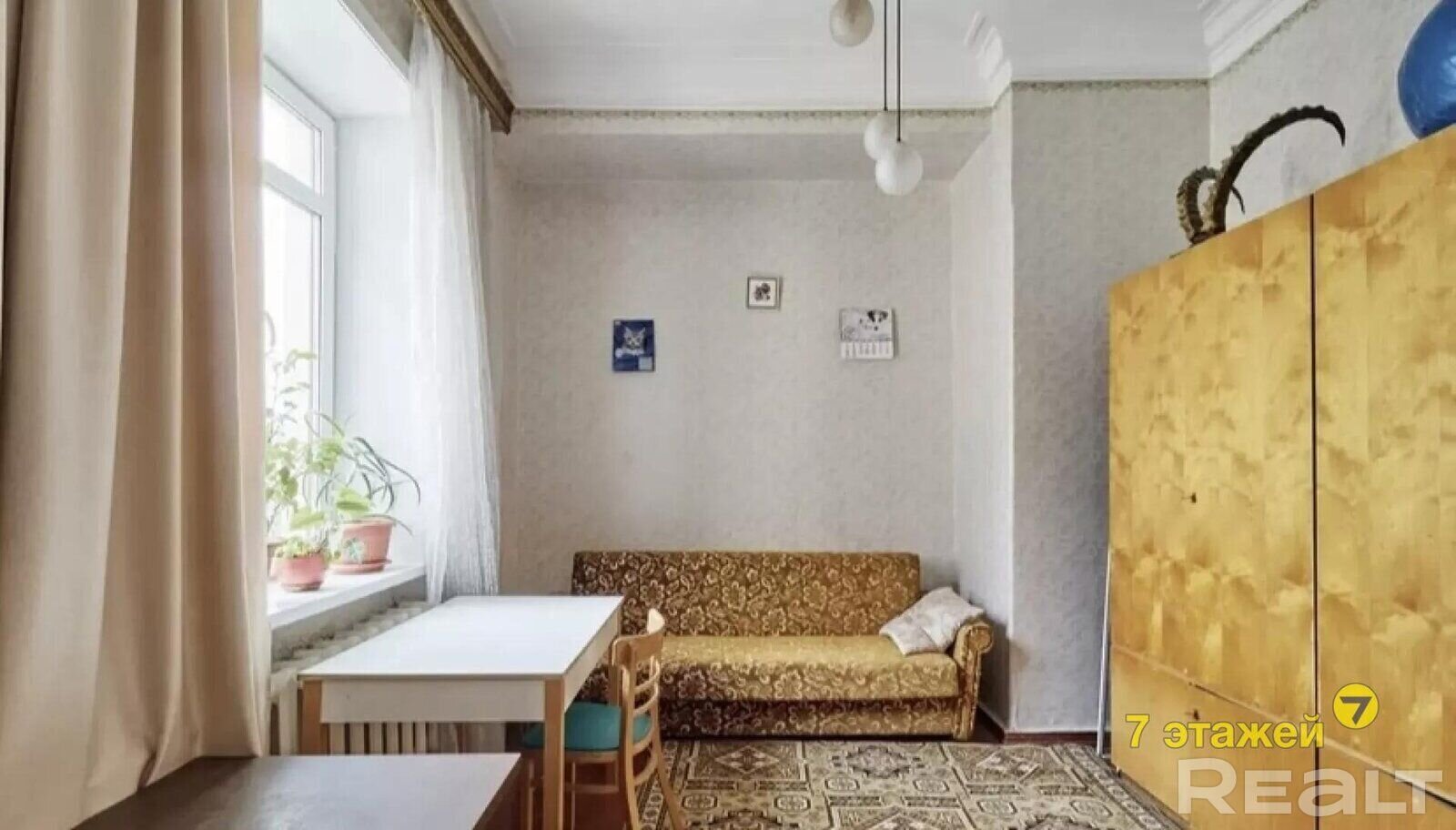 В этой сталинке четыре комнаты, две из которых раздельные. В квартире достаточно старый ремонт, но потолки высотой 3,2 метра. Общая площадь — 90 квадратов, жилая — 60. Кухня — 10 квадратных метров.