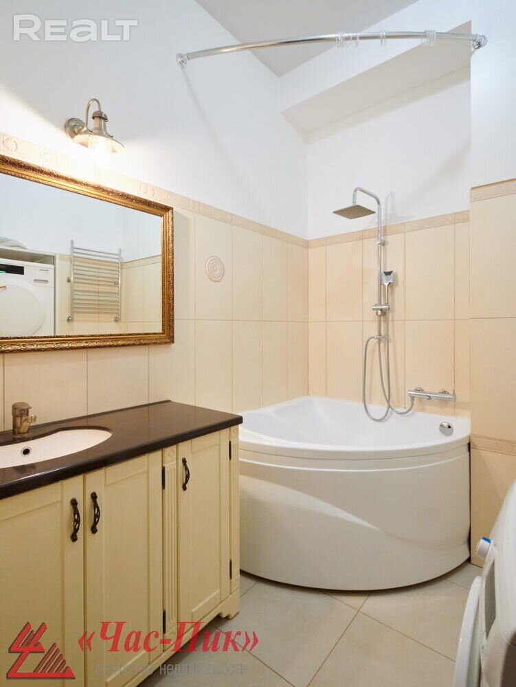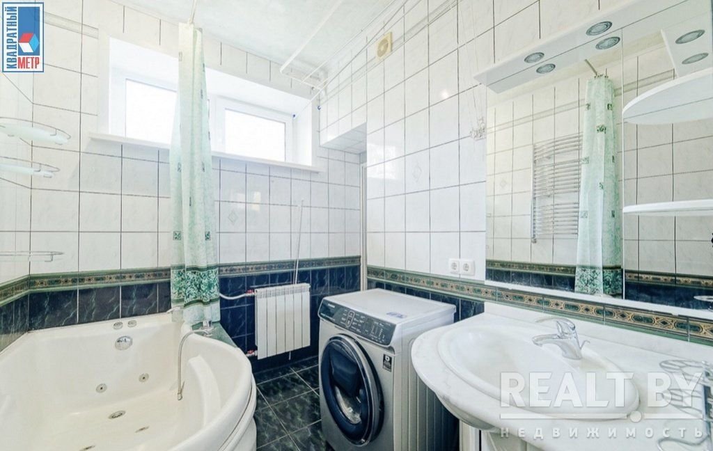 Санузел совмещенный. Он достаточно просторный и необычной планировки. Здесь есть и душевая кабина, и ванна. Установлена стиральная машина. А еще есть окно.
