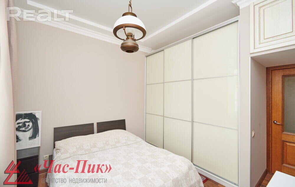 В спальне стоит большая кровать, комод, установлен шкаф-купе, есть антресоль.