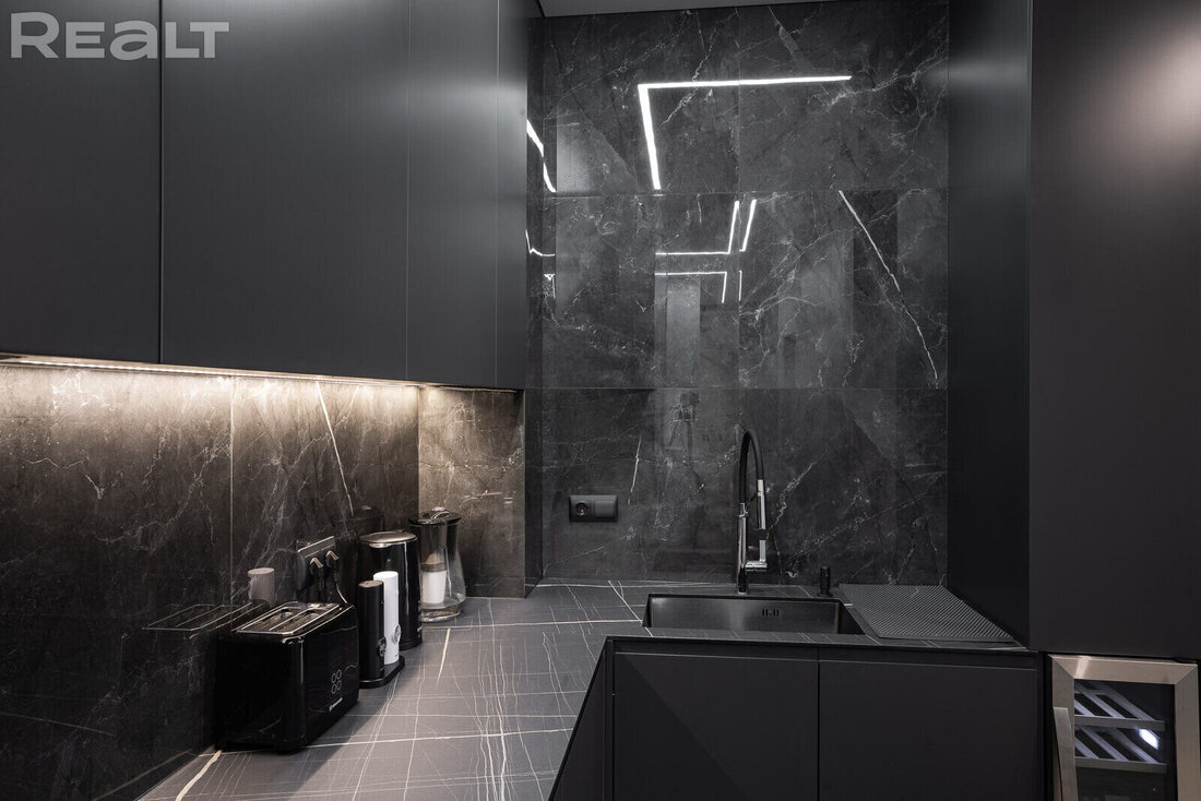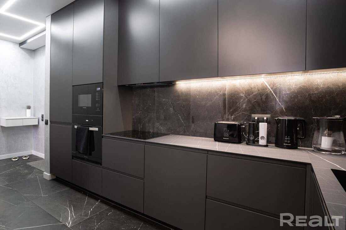 Квартира оборудована всей необходимой бытовой техникой европейского производства. На кухне имеется духовой шкаф, микроволновая печь, индукционная варочная поверхность, посудомоечная машина. Есть здесь и стиральная машина.