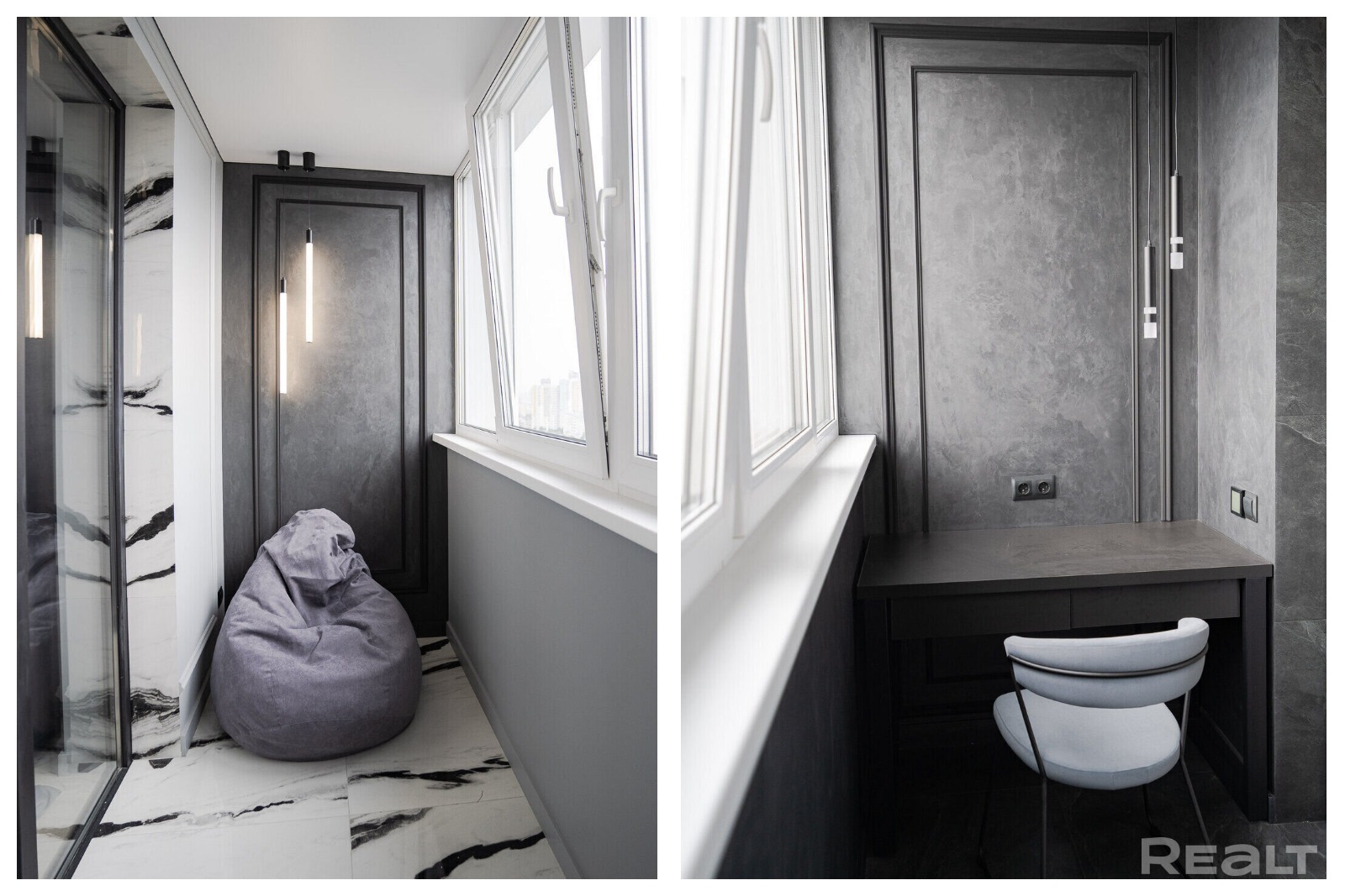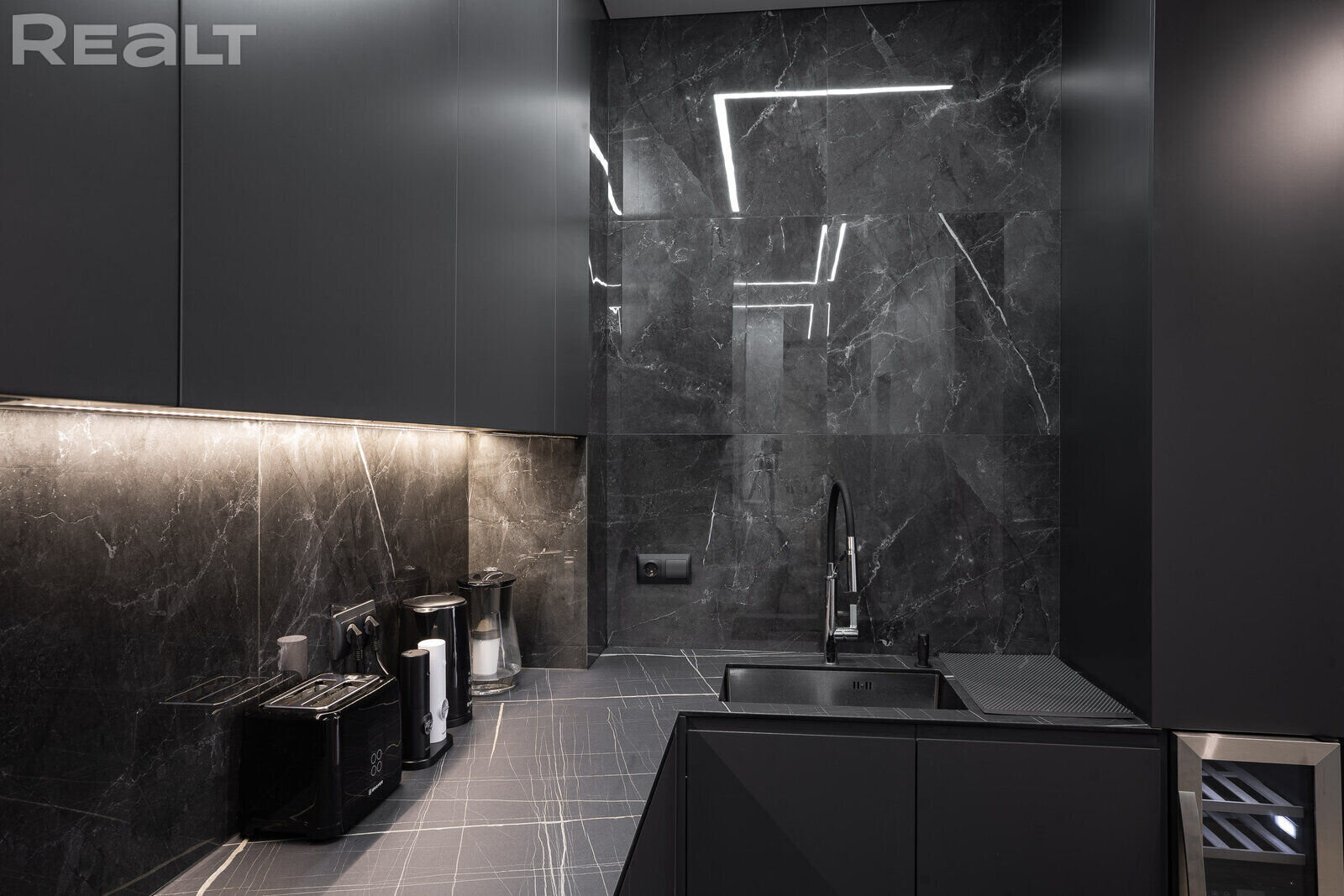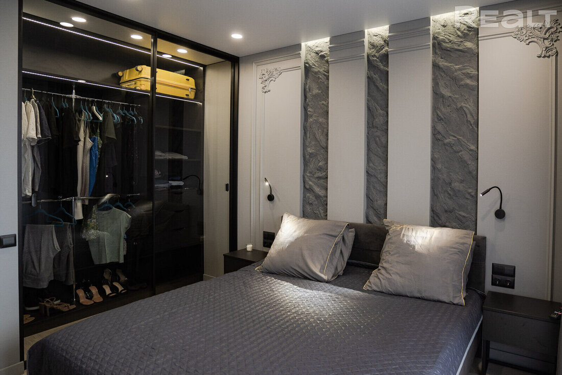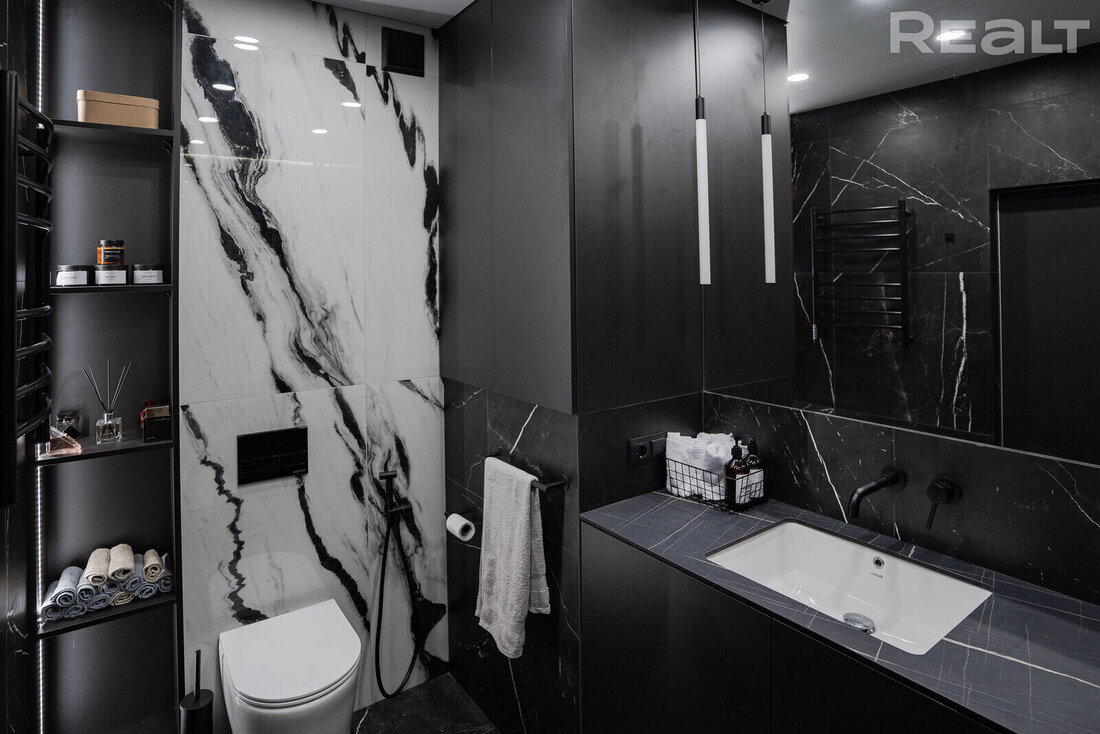 В трешке сделан дизайнерский ремонт в черных, белых и серых тонах. В качестве акцентных используются элементы золотых цветов. Кроме того, можно увидеть много мраморной плитки и декоративной штукатурки. В объявлении отмечено, что при ремонте использовались европейские материалы отделки высокого качества.