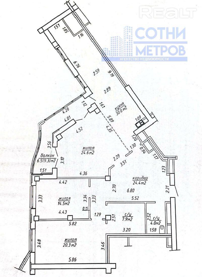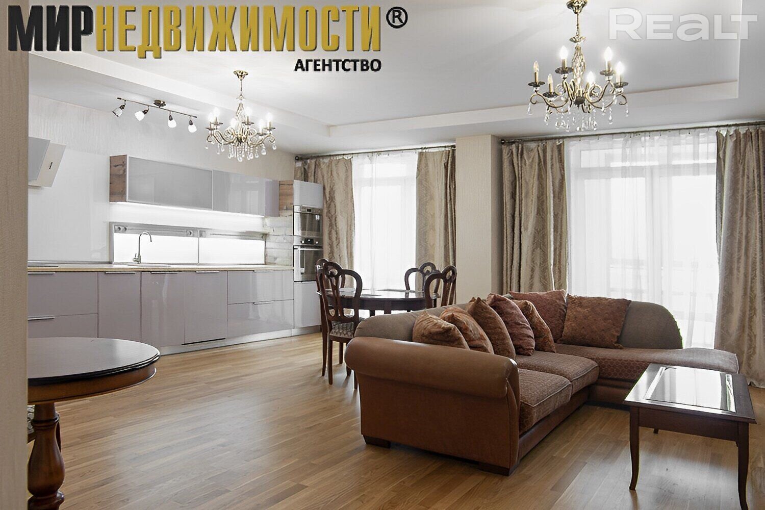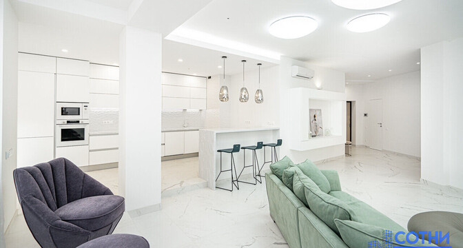 Закрывает топ-3 самых дорогих сделок, квартира за 365 тысяч долларов* (2904 долларов за квадрат). Эта трешка расположилась на 20 этаже. Общая площадь — 132 м, жилая — 59.4 м, кухня — 30 м. Высота потолков составляет 3 метра. В квартире 2 санузла, застекленная лоджия и оборудованная гардеробная.