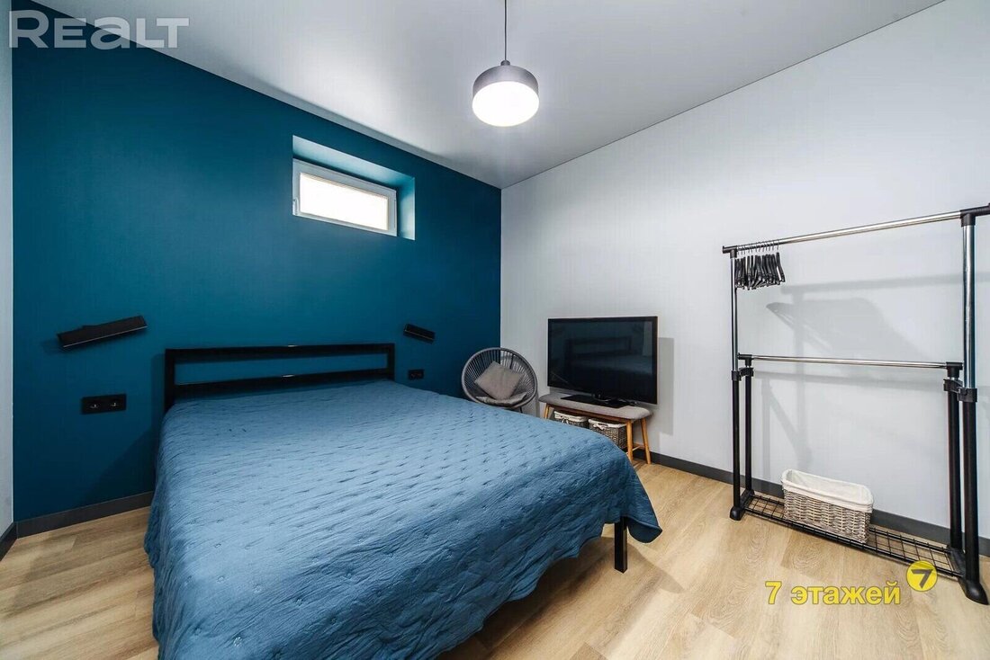 В спальне стоит большая кровать, кресло и телевизор. В этой комнате есть небольшое окно.
