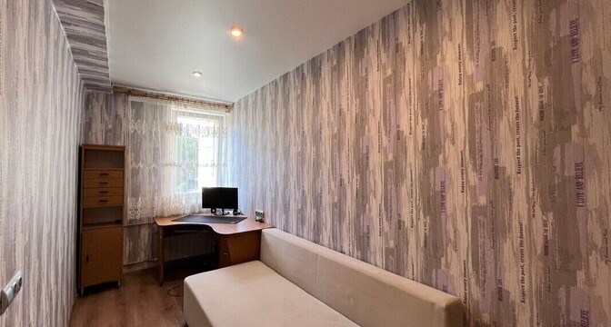 В жилой комнате стоит двухъярусная кровать, есть рабочее место. В комнате выход на застекленный балкон. На полах в квартире уложен линолеум.