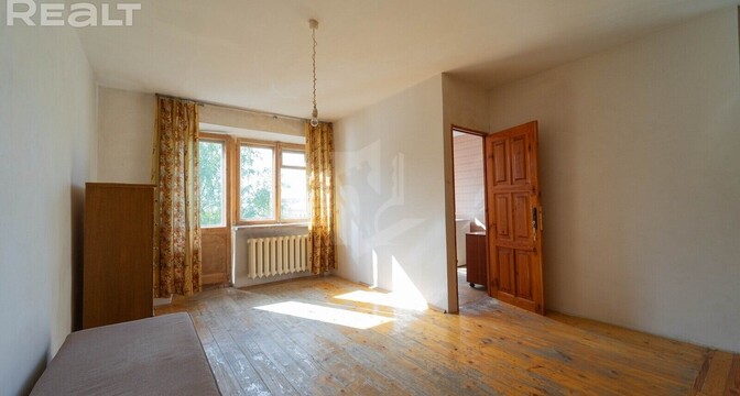 Общая площадь — 31 квадратный метр, жилая — 19. Кухня занимает 6 метров. Планировка в квартире утверждена. В кухне нет мебели. В гостиной есть выход на балкон. Полы деревянные. Нужно делать ремонт. Санузел совмещенный. Вот как выглядит квартира.