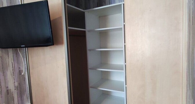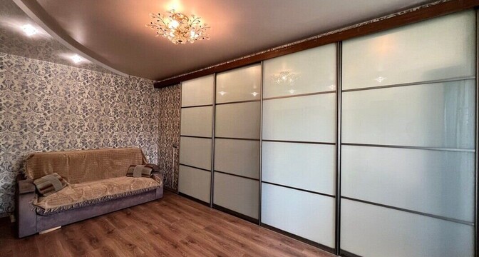 Общая площадь — 30 квадратов, жилая — 17. Кухня — 7 метров. Вот как выглядит жилая комната. Здесь установлен шкаф-купе. Кухня требует ремонта, написано в объявлении. Потолки в квартире выше трех метров. Заменены окна.