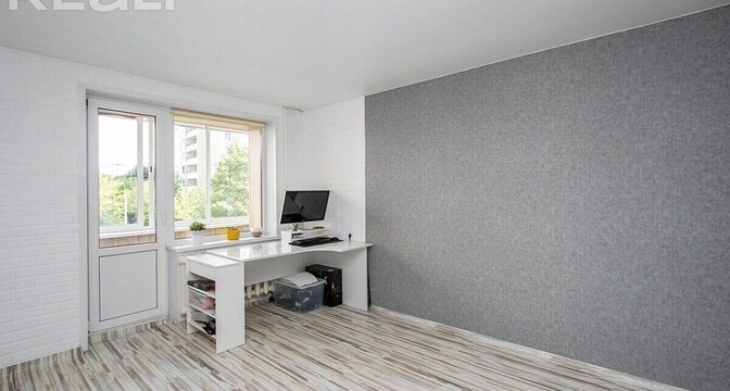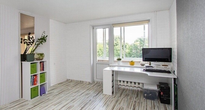 Жилые комнаты — просторная гостиная и кабинет. В меньшей комнате установлен большой шкаф-купе с системами хранения. В квартире есть кондиционер.