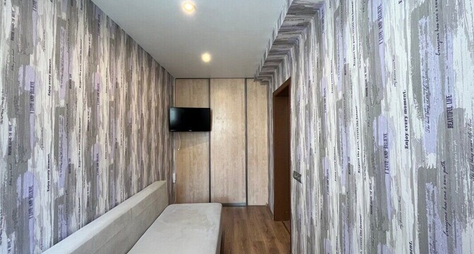В квартире 35 квадратов общей площади, жилые — 17, кухня — 8 метров. Из необычного — в кухне есть кровать-трансформер: в собранном виде визуально она выглядит как обычный комод, а в разобранном — плюс спальное место.