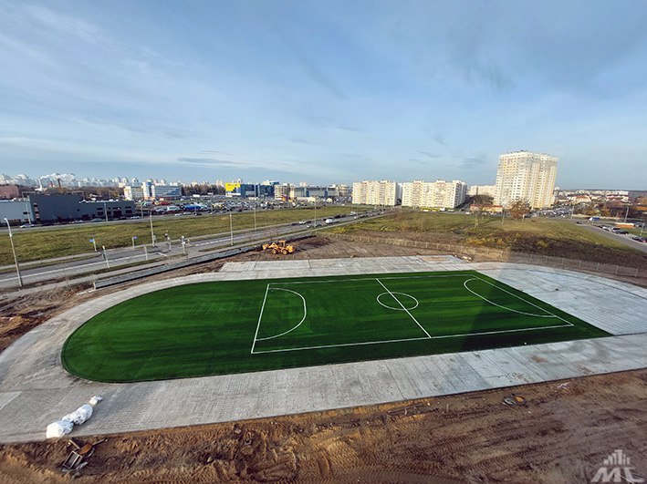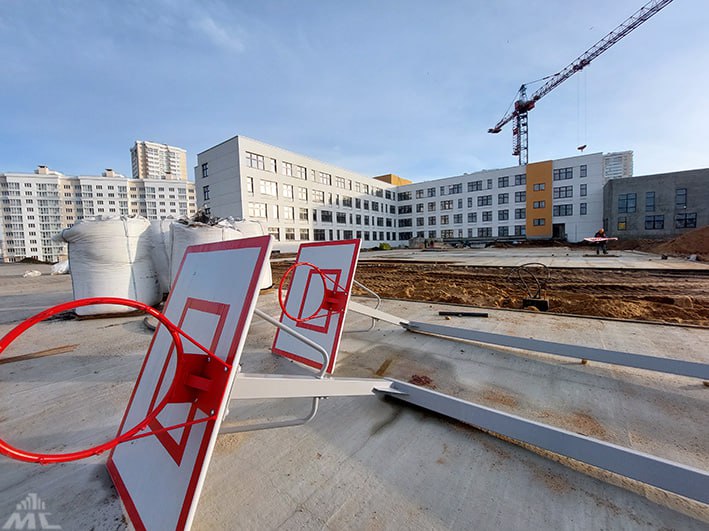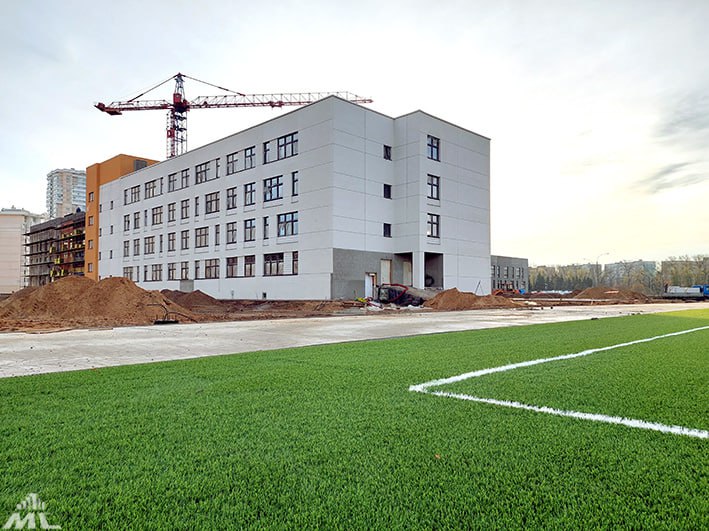 В настоящий момент на территории будущей школы уже ведется благоустройство. Новое футбольное поле покрылось зеленым ковром из травы, готово основание под беговые дорожки, волейбольные и баскетбольные площадки, прыжковую яму. Вот-вот установят баскетбольные кольца и малые архитектурные формы. А как только стройплощадку покинет последний башенный кран, тут начнется укладка плитки.