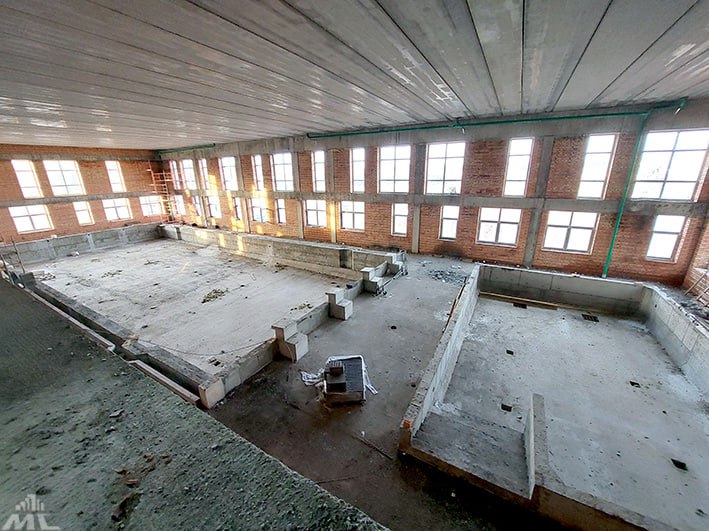 Рядом со школой возводится двухэтажный блок с двумя бассейнами: на первом этаже тут будут помещения для юных пловцов, а на втором — трибуны для зрителей.