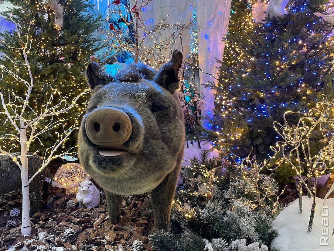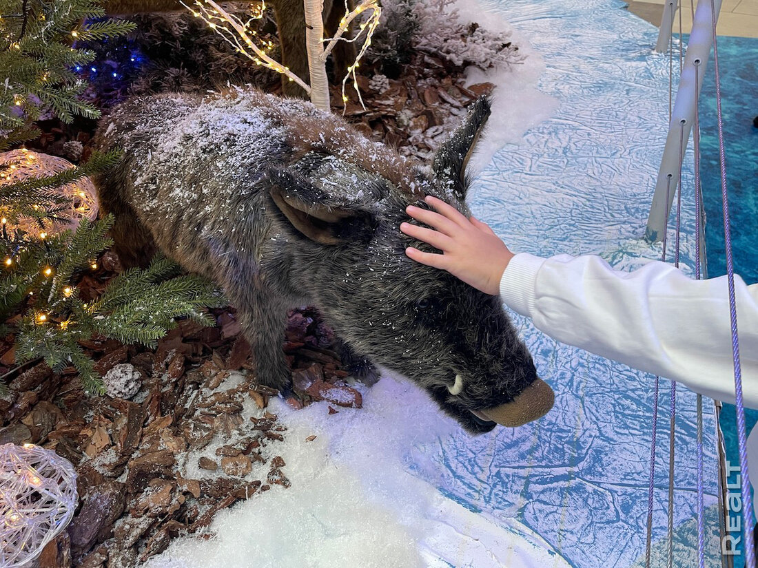 Как и в прошлые годы, фотозона интерактивная. Животные двигают головами, открывают рты, а зубр читает сказку на белорусском языке. А еще все светится праздничными огнями.