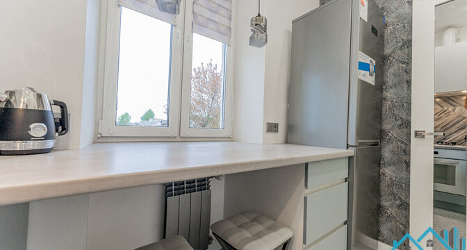 Квартира полностью готова к проживанию. Кухня оборудована гарнитуром, вытяжкой и варочной газовой панелью. Обеденная группа выполнена в виде высокой барной стойки с высокими стульями. После покупки тут также останутся стиральная машина, телевизор и встроенная мебель.