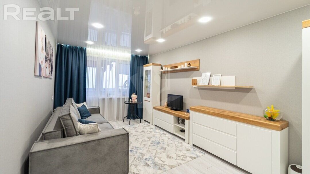 В квартире сделан хороший ремонт. На полу тут лежат плитка и ламинат. Имеются встроенная кухня с варочной панелью, духовым шкафом и вытяжкой, а также барная стойка. В жилой комнате есть выход на застекленный балкон. В комнате сделана небольшая зона с оборудованной гардеробной.