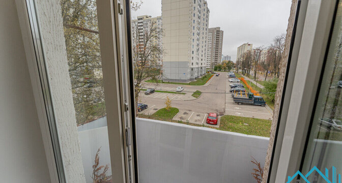 В квартире сделан хороший ремонт. Есть застекленный балкон. Пол утеплен пеноплексом и залит стяжкой. В комнате лежит ламинат с фаской, в коридоре и кухне — линолеум. Потолки — натяжные.