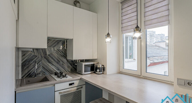 Квартира полностью готова к проживанию. Кухня оборудована гарнитуром, вытяжкой и варочной газовой панелью. Обеденная группа выполнена в виде высокой барной стойки с высокими стульями. После покупки тут также останутся стиральная машина, телевизор и встроенная мебель.