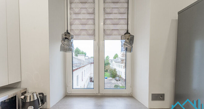 В квартире сделан хороший ремонт. На полу тут лежат плитка и ламинат. Имеются встроенная кухня с варочной панелью, духовым шкафом и вытяжкой, а также барная стойка. В жилой комнате есть выход на застекленный балкон. В комнате сделана небольшая зона с оборудованной гардеробной.
