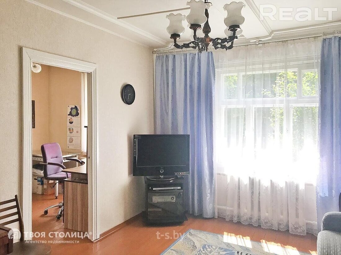 Стены ровные, с обоями. Потолки высокие, деревянные, выкрашенные в белый цвет. Пол деревянный. Общее впечатление — может не очень современно, но срочный ремонт не требуется.