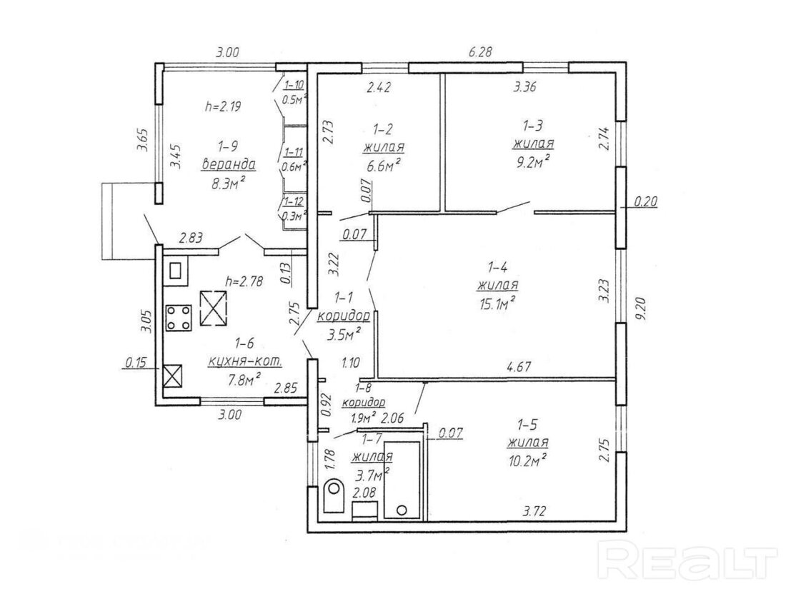 Дом одноэтажный, хотя вполне можно переделать чердак в жилую мансарду. Общая площадь — 67,7 м2. Планировка имеет свои особенности. Вход через веранду, из нее попадешь в кухню, в которой находится газовый котел двухконтурный с подогревом воды Bosch.