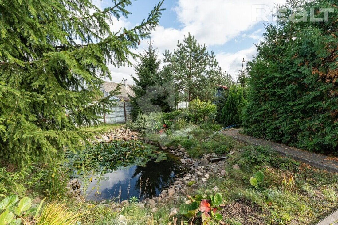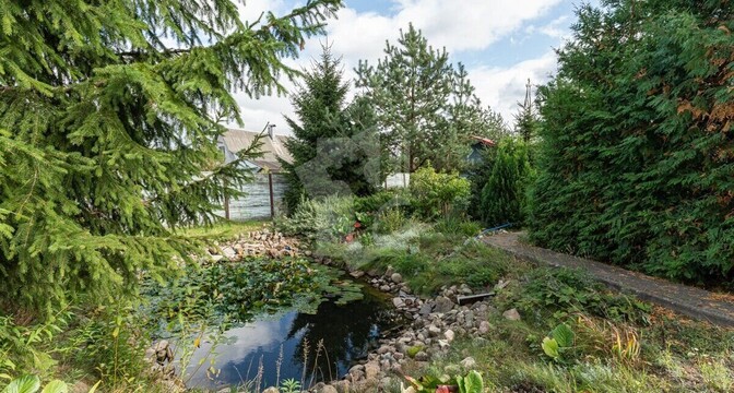 Участок довольно просторный — 15 соток. На нем каждый метр обустроен — мощенные парковка и дорожки, декоративный пруд, взрослые деревья, газон, цветники и так далее.