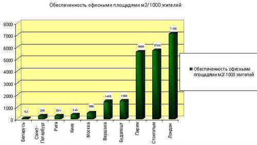 Что касается г. Минска, то на 1000 жителей столицы приходится около 45 кв.м. офисных площадей нового формата (введенные в эксплуатацию бизнес-центры и здания административно-торгового назначения). В столице на данный момент введено в эксплуатацию более 10 зданий офисного и административно-торгового назначения общей площадью более 115 000 кв.м., причем в структуре общих площадей более 10% приходится на площади торгового, сервисного и развлекательного назначения (магазины, аптеки, конференц-залы, отделения банков, кафе, рестораны, косметические салоны, парикмахерские и др.).