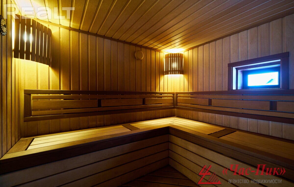 Еще одна постройка на участке — это русская баня на дровах. Она также собрана из бруса и отделана деревом.