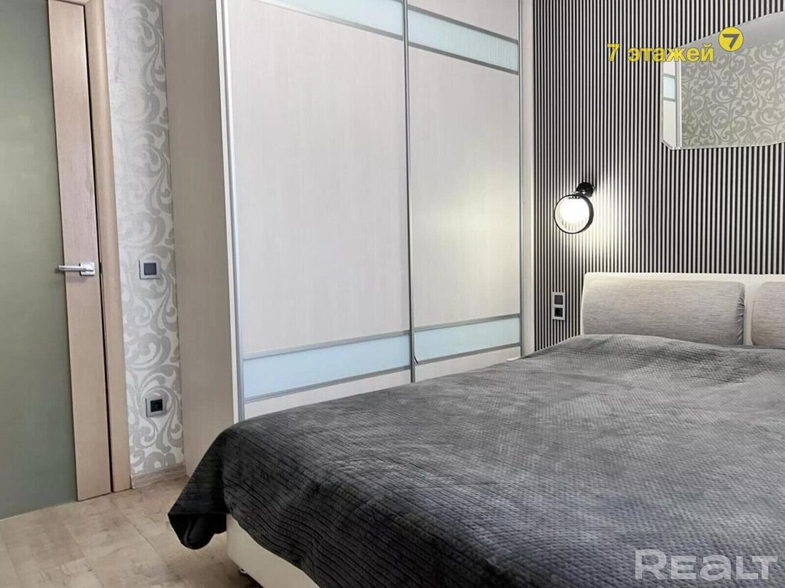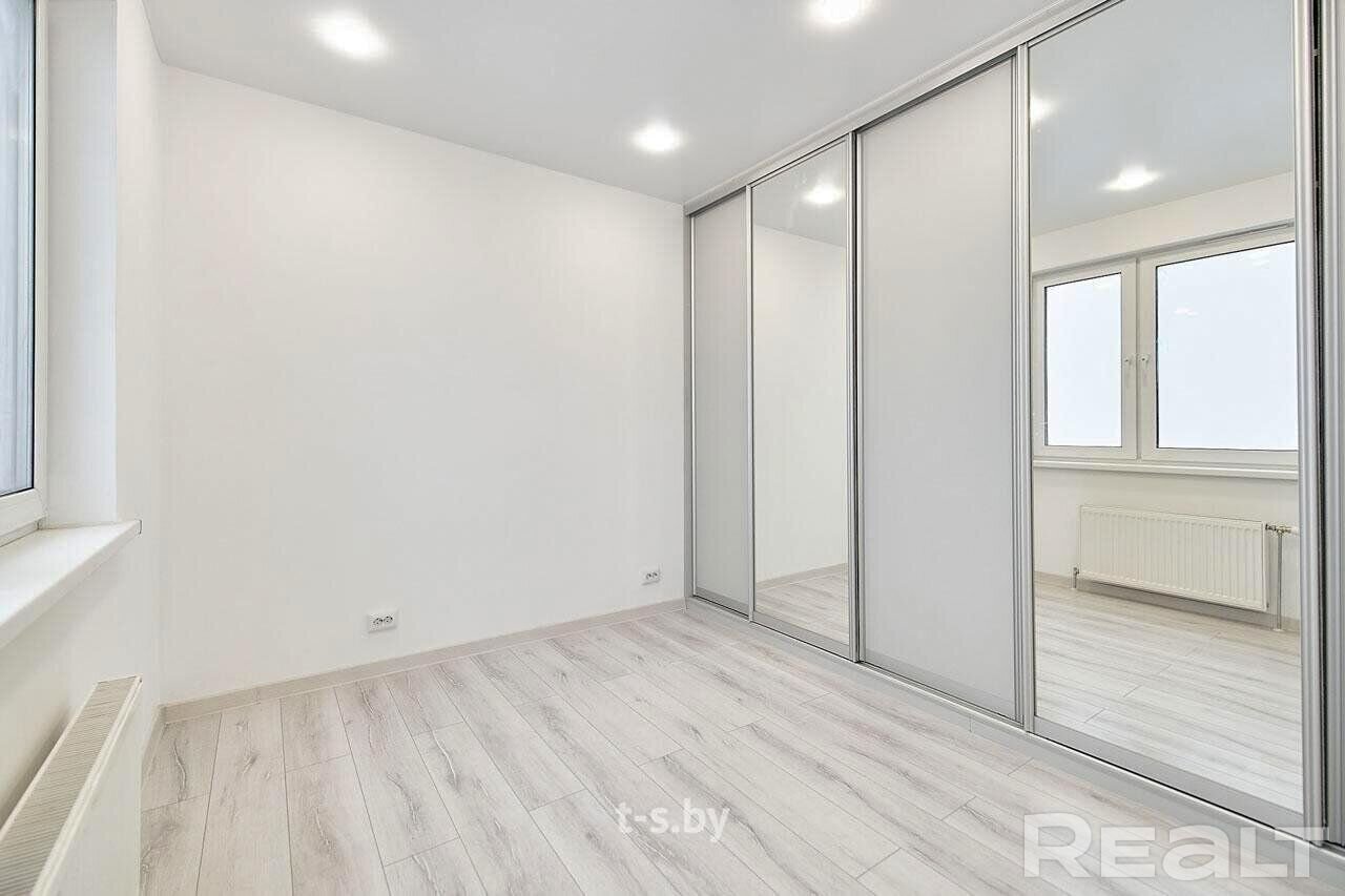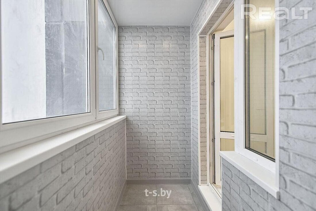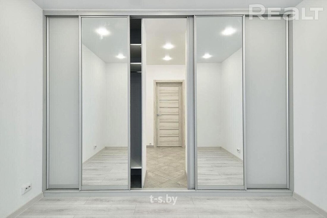 В квартире сделан ремонт. Площадь разделана между спальней, в которой также есть выход на застекленную лоджию, и кухней-гостиной. Отделяют эту спальню от коридора встроенные шкафы с зеркальной дверью.