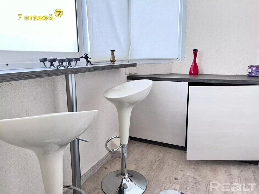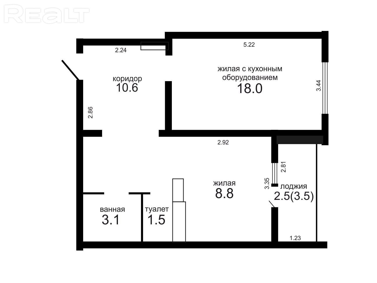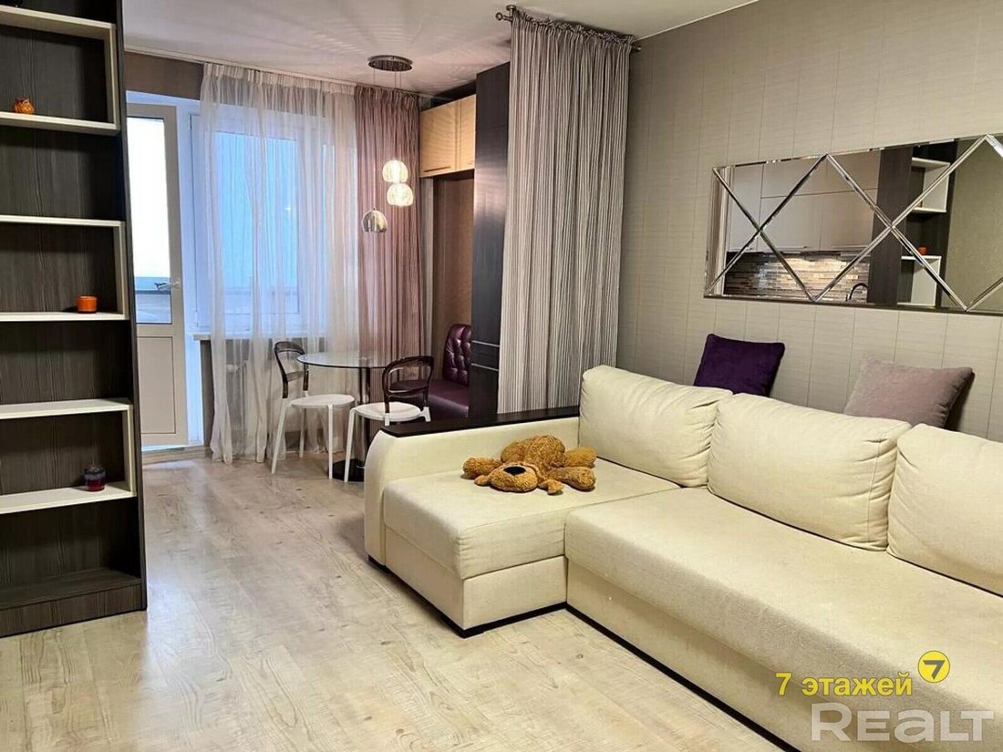 В квартире сделан ремонт. Площадь разделана между спальней, в которой также есть выход на застекленную лоджию, и кухней-гостиной. Отделяют эту спальню от коридора встроенные шкафы с зеркальной дверью.