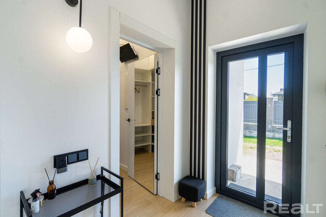 Дом находится в СТ «Анусино-2008» — это Минский район, недалеко от Заславля, но ближе к МКАД-2. Его возвели в 2021 году из керамзитобетонных блоков, стены утеплили минватой. Крышу устелили модульной металлочерепицей Budmat. Перекрытия — деревянные. Общая площадь дома — 121 м².