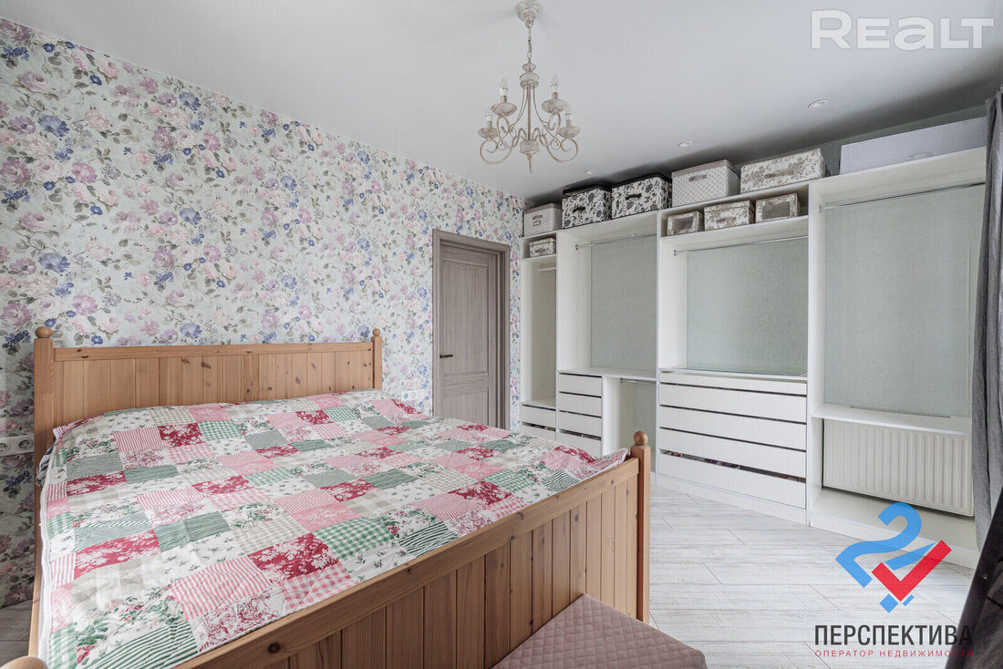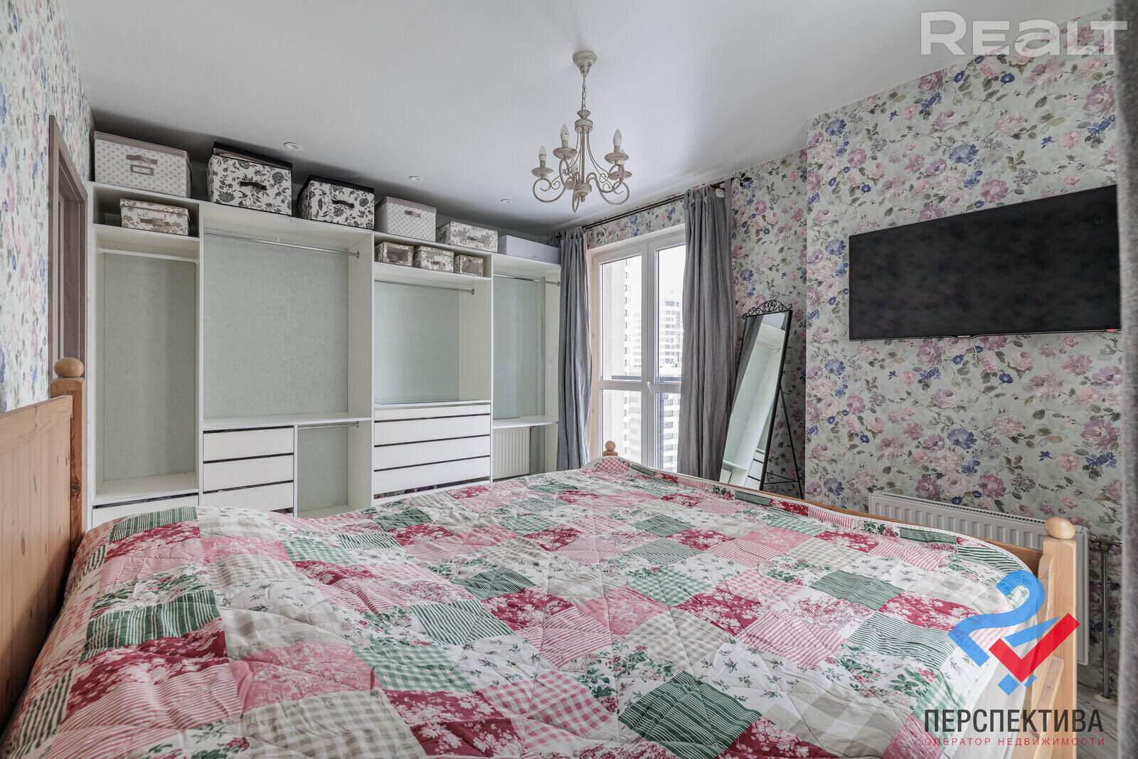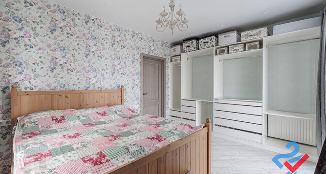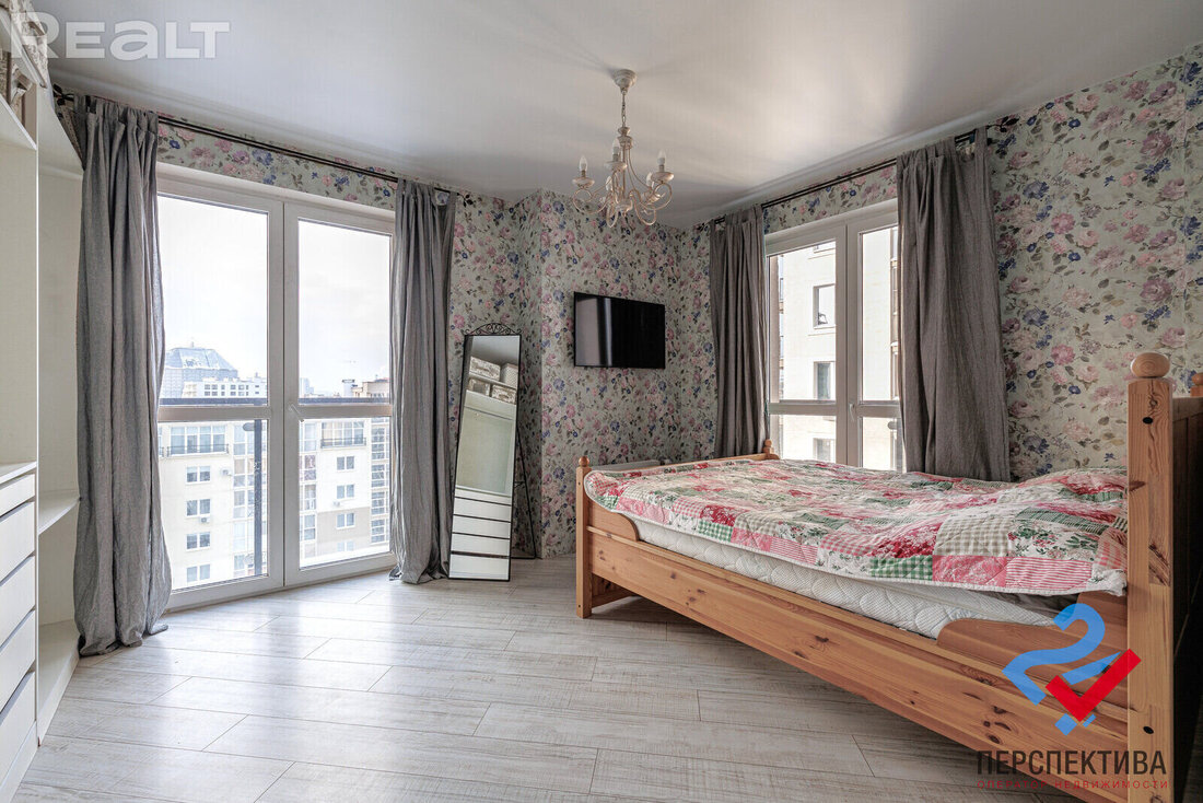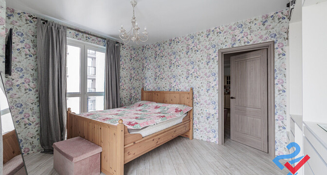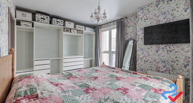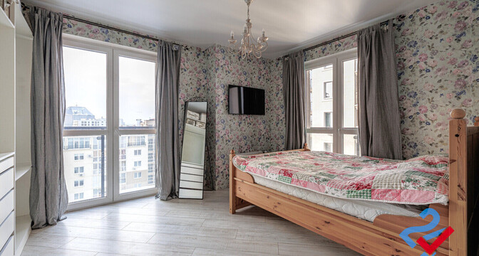 В изолированной спальне — два французских балкона с панорамными окнами в пол. В комнате стоит двуспальная кровать, оборудована гардеробная во всю стену.
